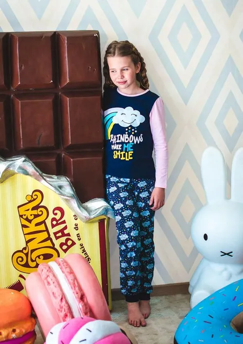 Пижама для девочки из трикотажа супрем. Однотонный джемпер с принтом в виде облачка, брюки с набивным рисунком. На рукавах джемпера - широкие манжеты, низ обработан плоскими швами. В брюках эластичный пояс на резинке и мягкие манжеты.