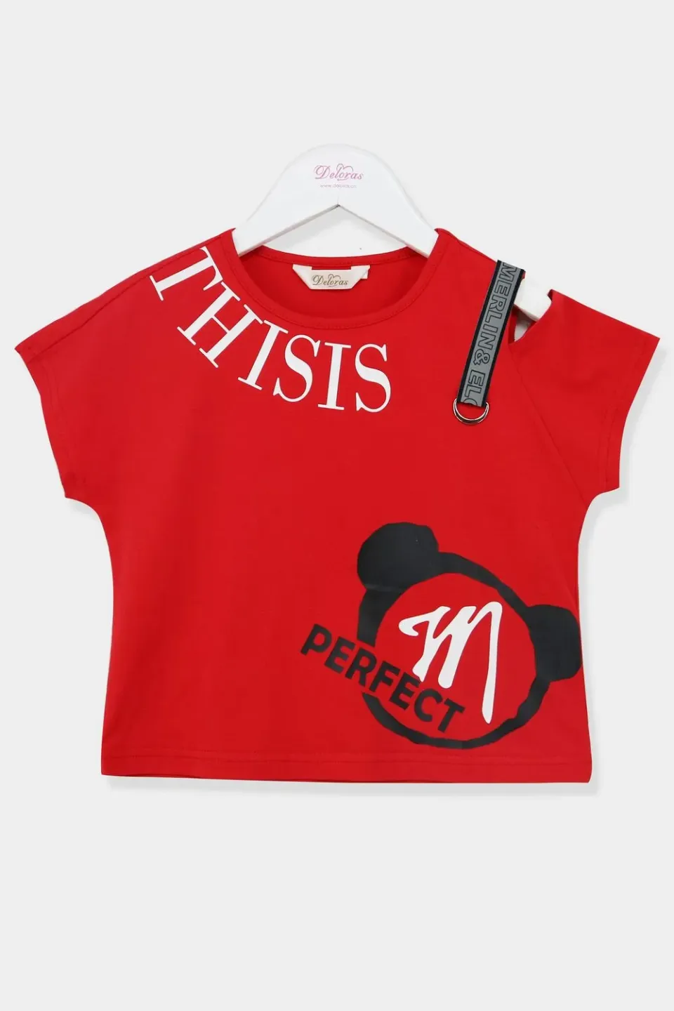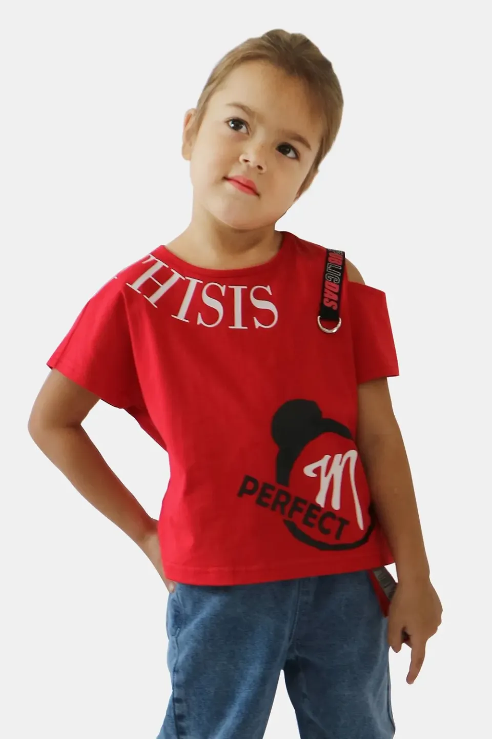 Оригинальная дизайнерская задумка не оставит равнодушной юную модницу. Изделие выполнено из высококачественного хлопкового трикотажа с добавлением эластана для поддержания формы. Модель украшена оригинальным принтом на плече и декоративной тесьмой.