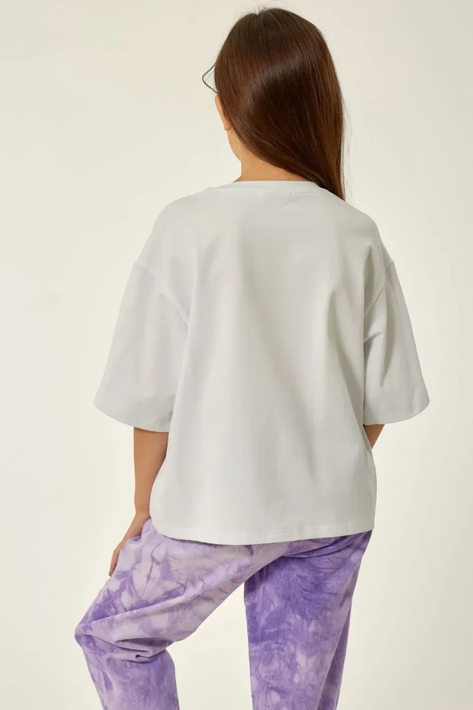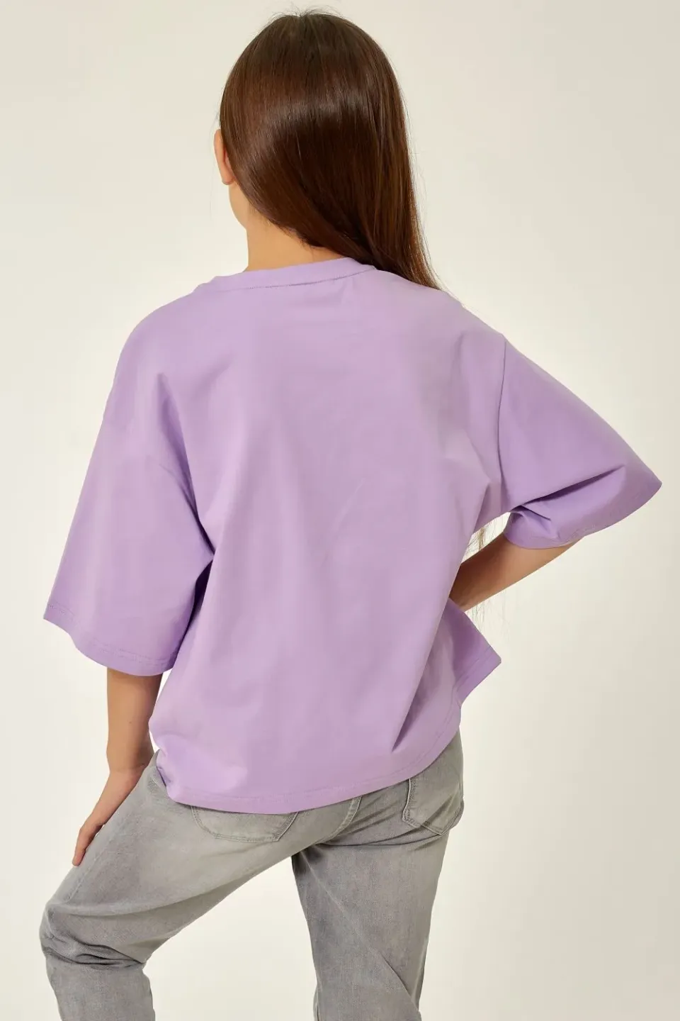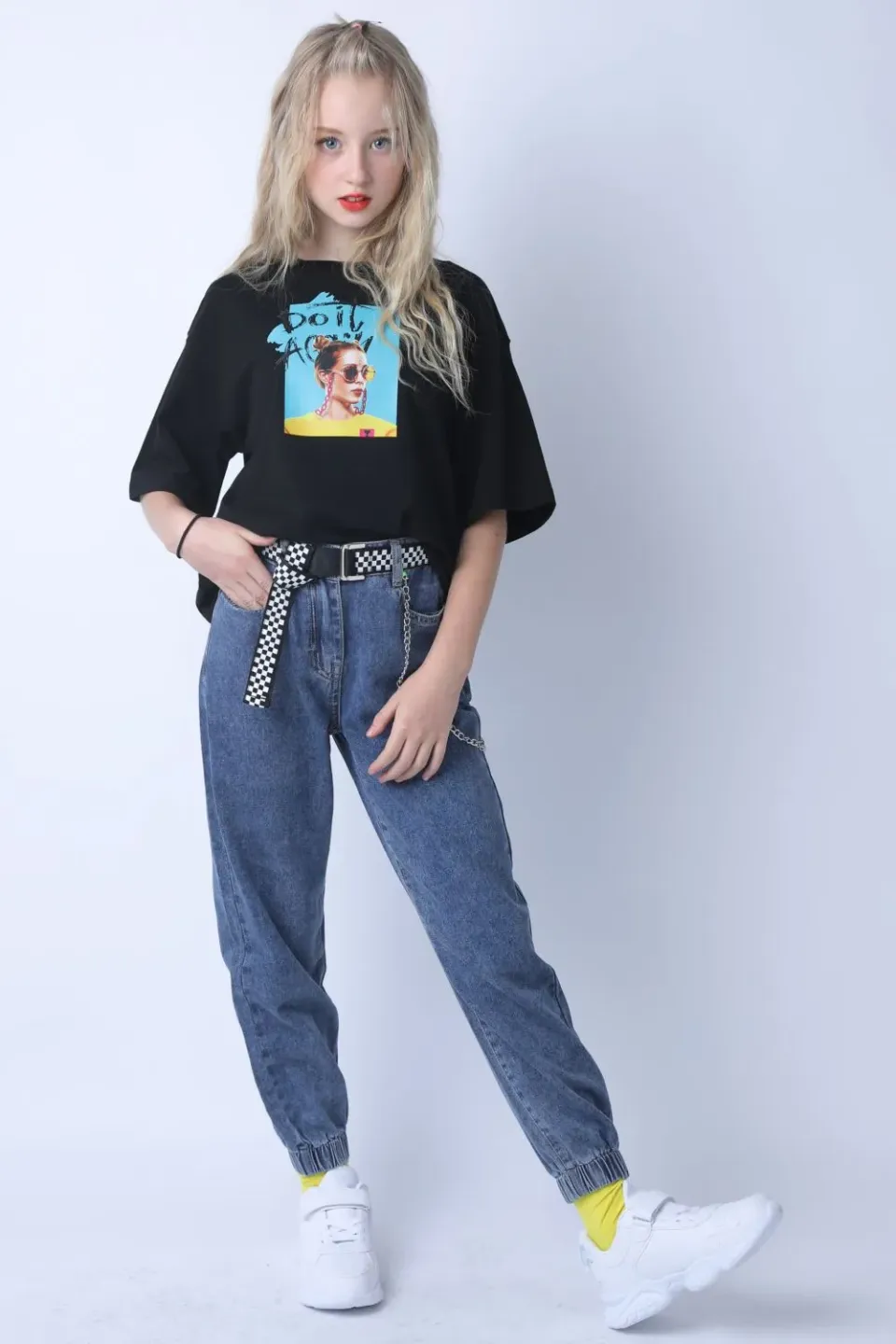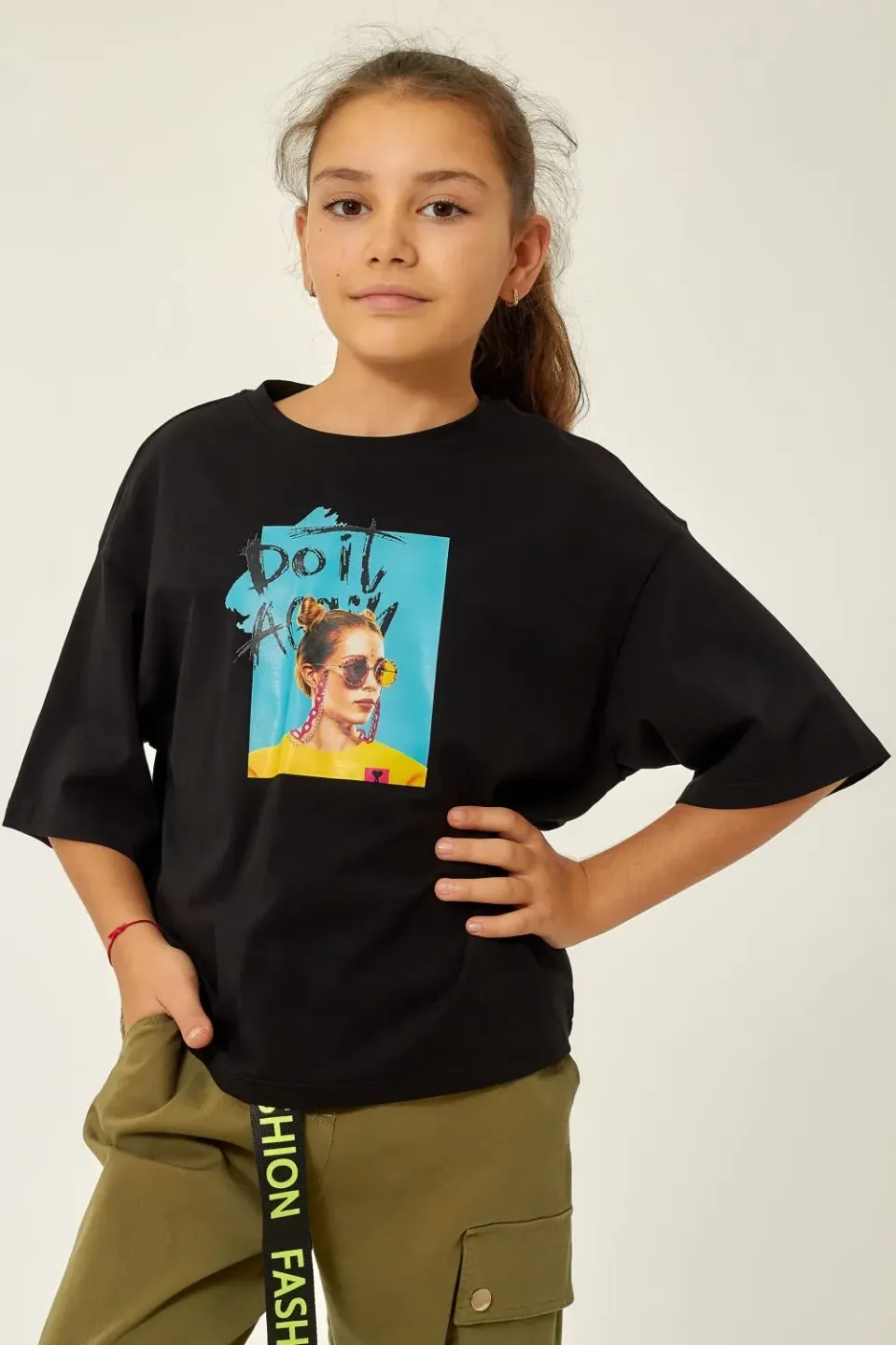 Укороченная подростковая футболка на летний сезон. Декоративная деталь выполнена в технике фотопечать. Стирка в рекомендуемом на этикетке режиме сохранит внешний вид украшения. Футболка свободного фасона, из тонкой трикотажной ткани. Материал приятный, гладкий, натуральный.