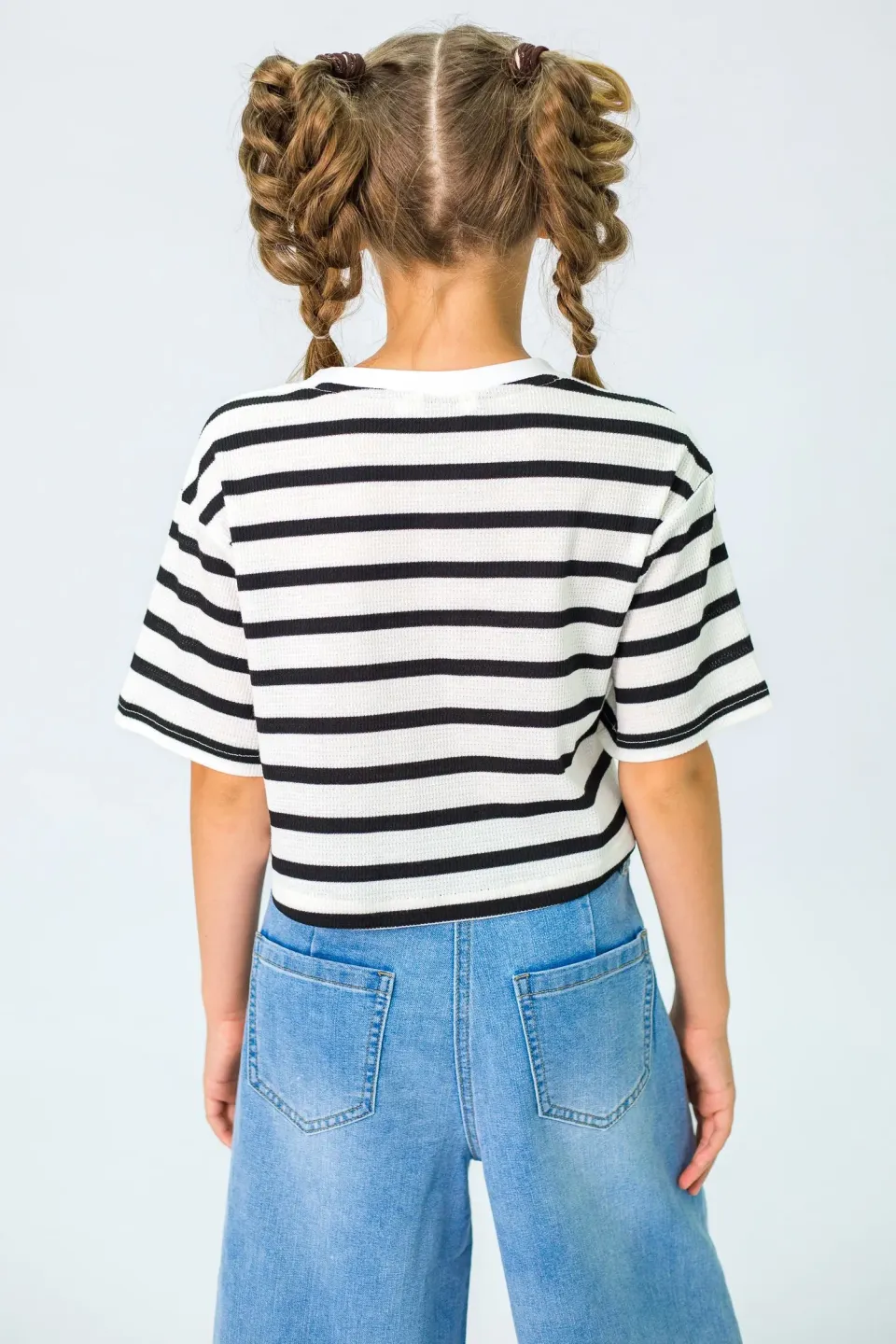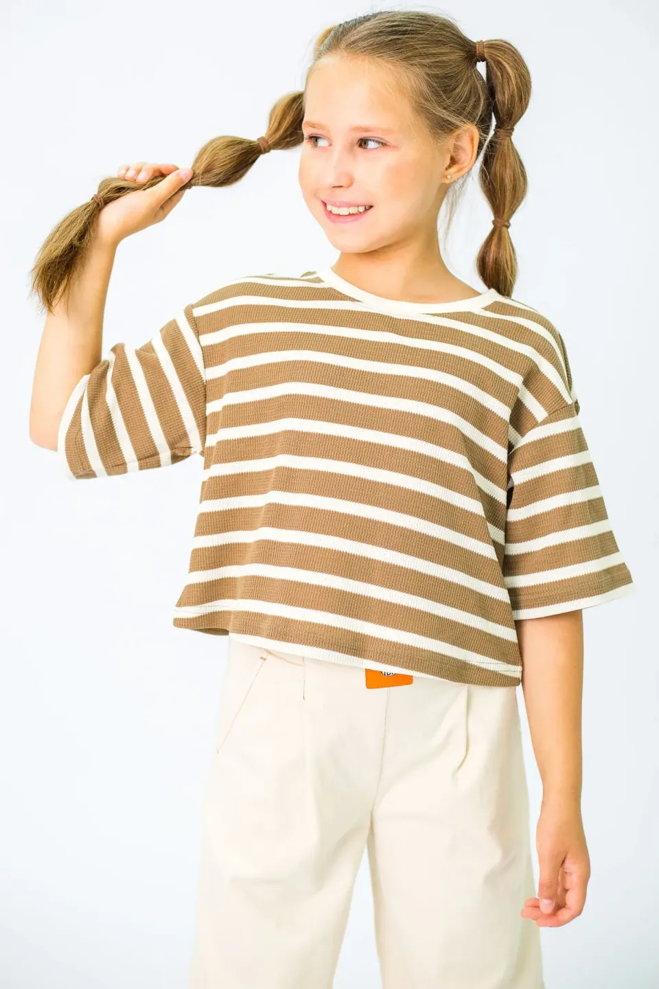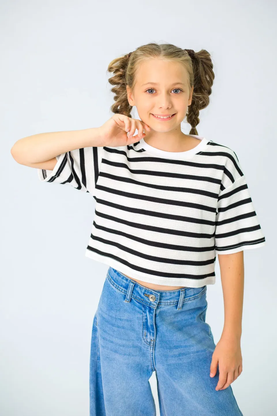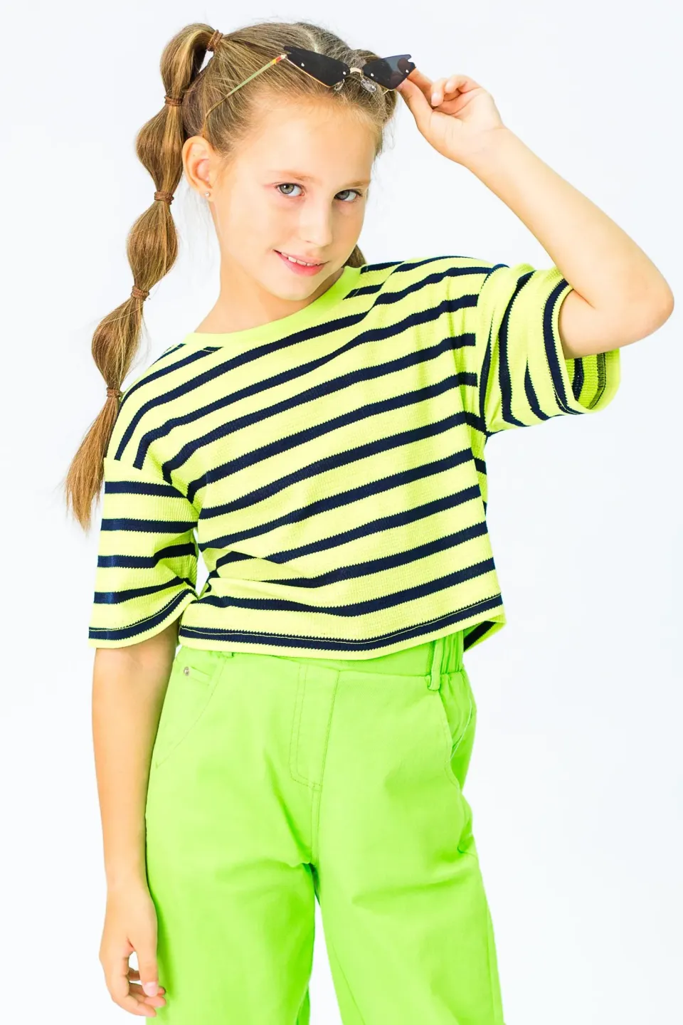 Укороченная футболка свободного покроя oversize сшита из практичной смесовой ткани с высоким содержанием хлопка. Она прямая, без пояса. Рукава широкие и короткие. Вырез горловины круглый. Внимание привлекает яркий рисунок в полоску и симпатичная фактура ткани.