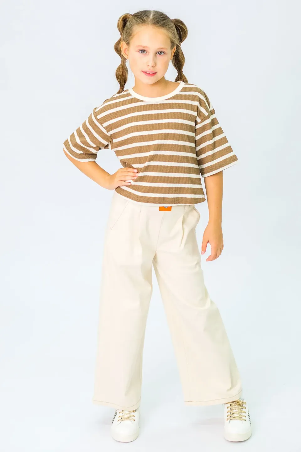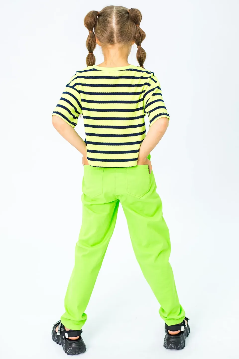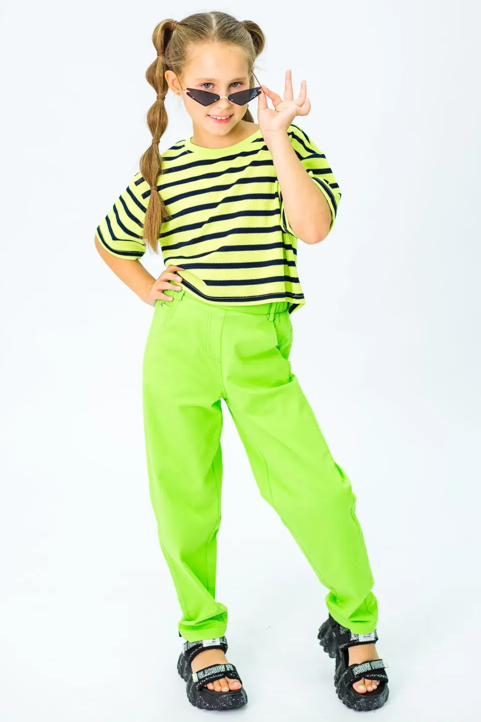 Укороченная футболка свободного покроя oversize сшита из практичной смесовой ткани с высоким содержанием хлопка. Она прямая, без пояса. Рукава широкие и короткие. Вырез горловины круглый. Внимание привлекает яркий рисунок в полоску и симпатичная фактура ткани.