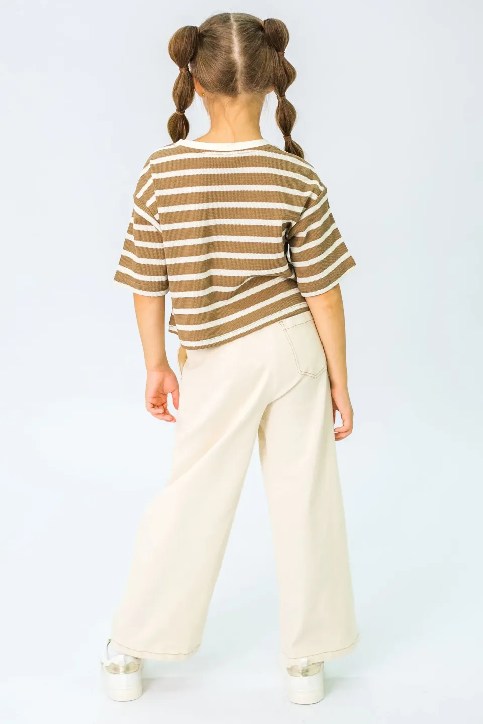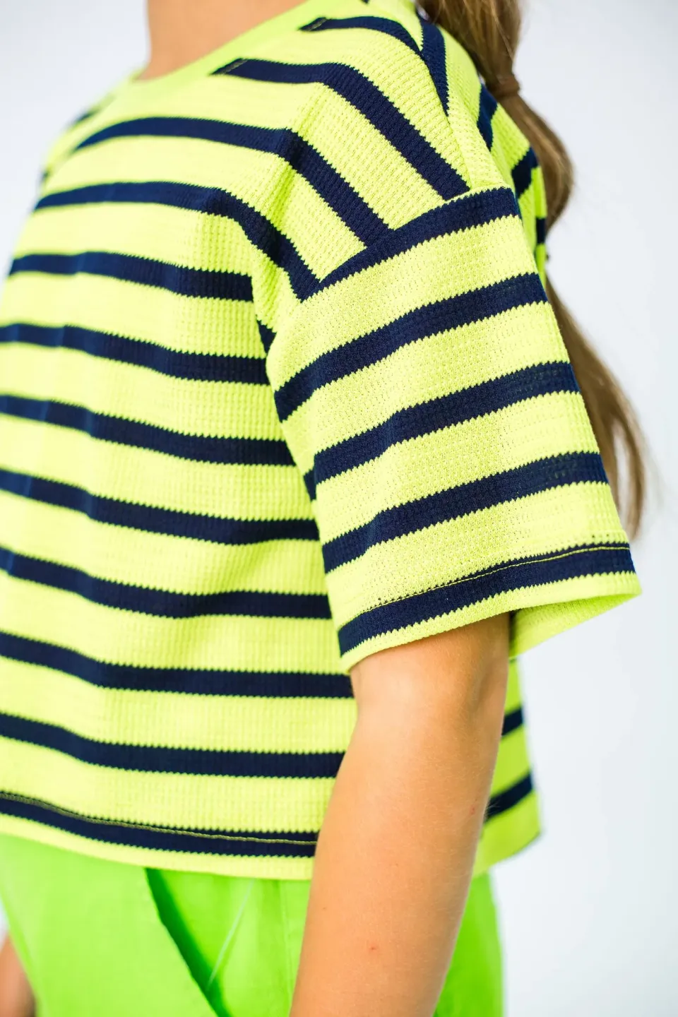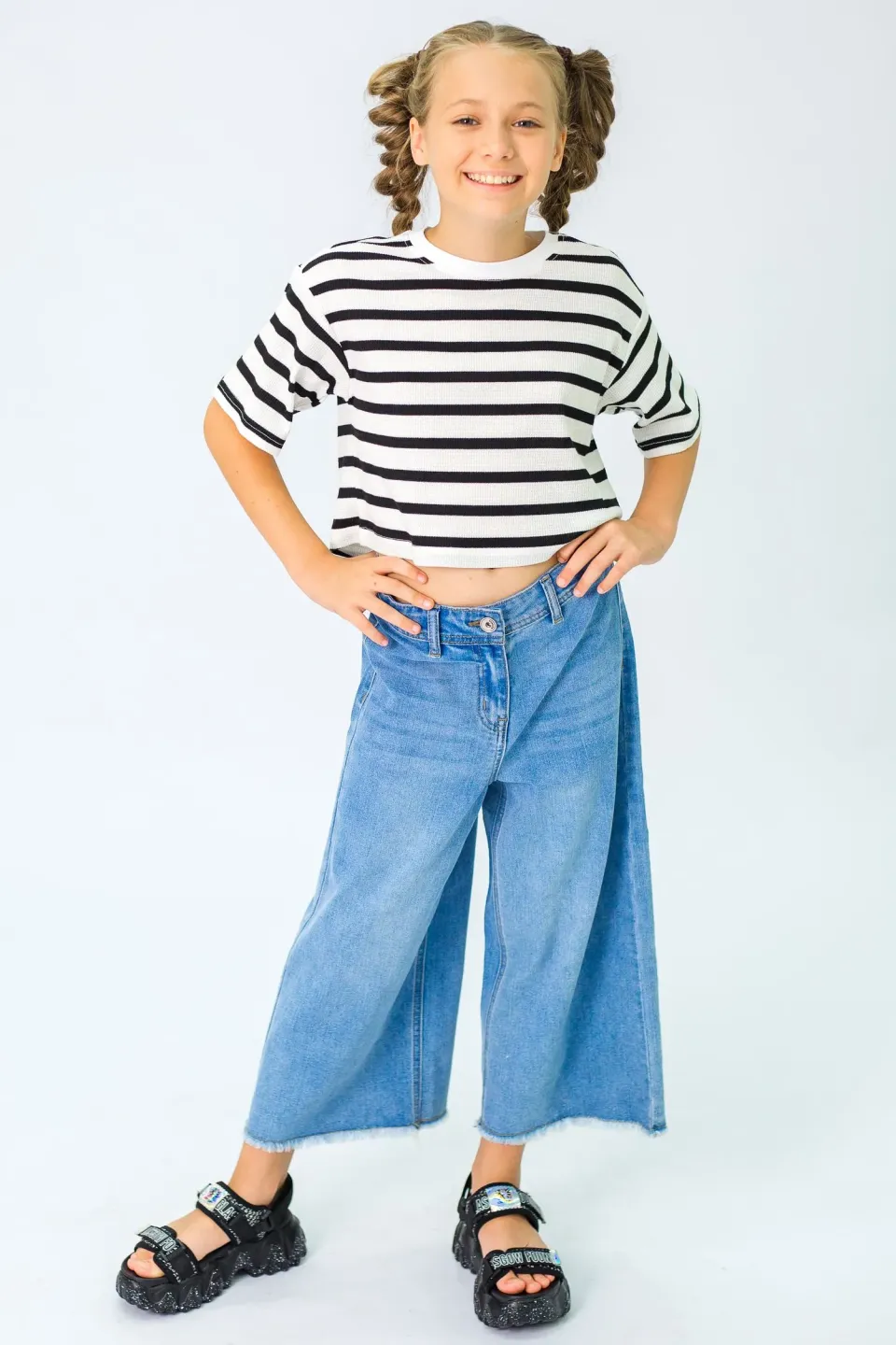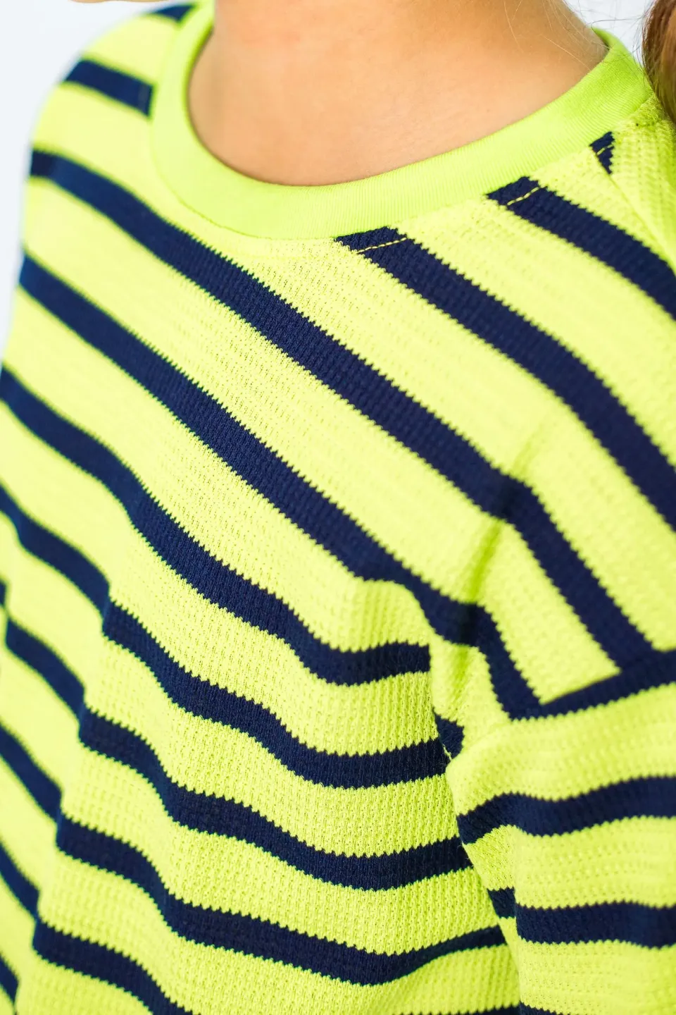 Укороченная футболка свободного покроя oversize сшита из практичной смесовой ткани с высоким содержанием хлопка. Она прямая, без пояса. Рукава широкие и короткие. Вырез горловины круглый. Внимание привлекает яркий рисунок в полоску и симпатичная фактура ткани.