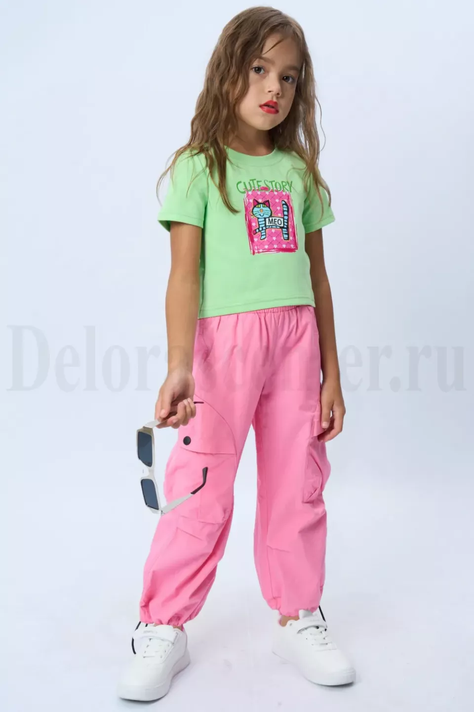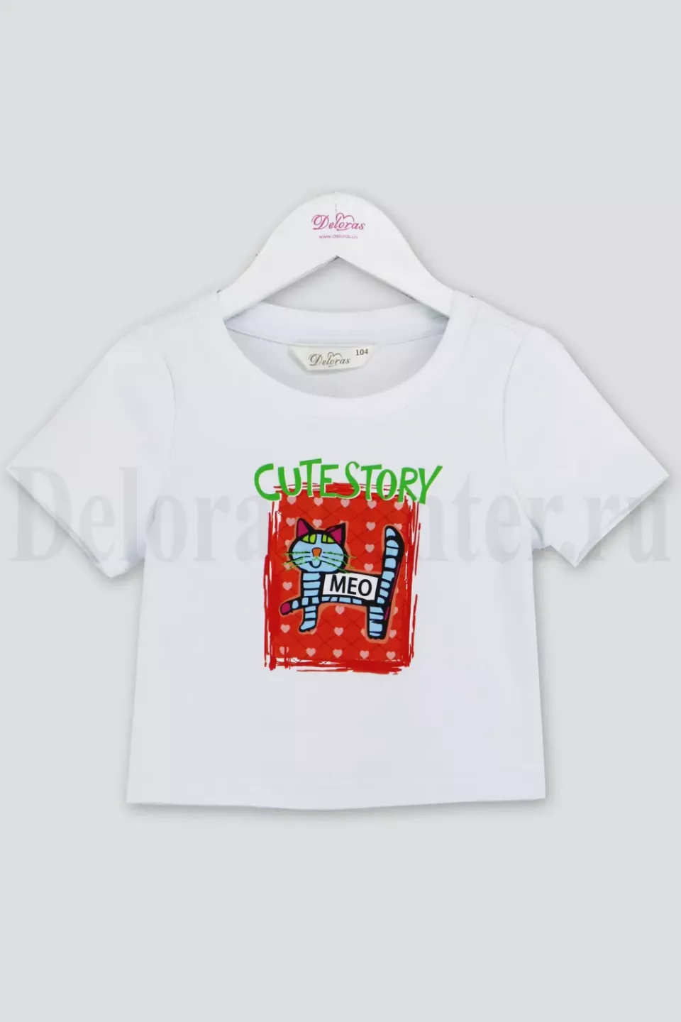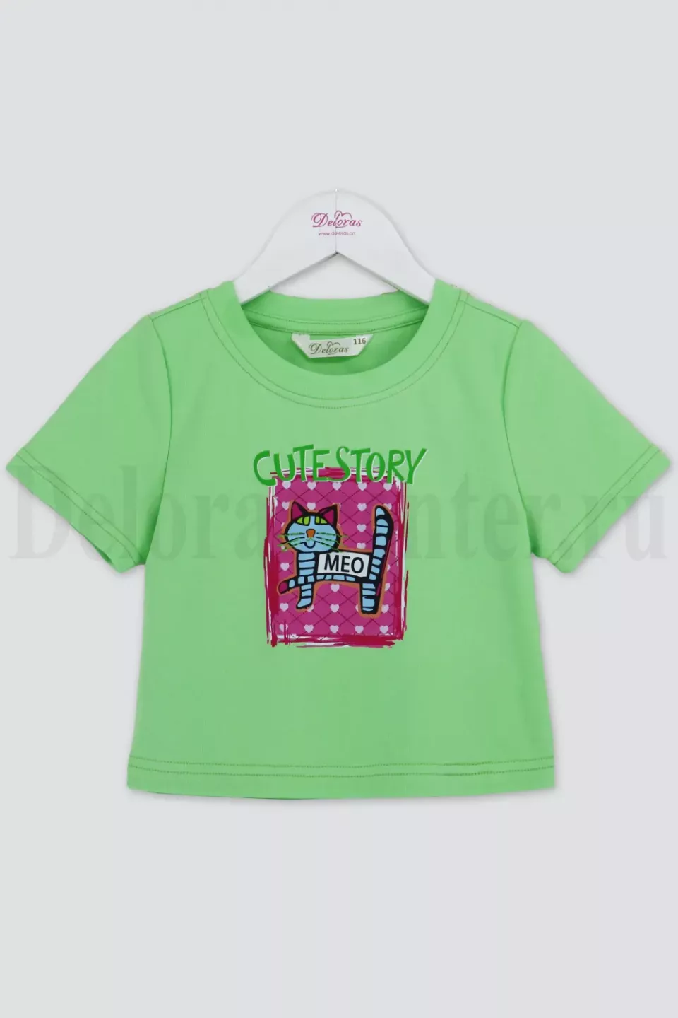 Летняя футболка для девочки сшита из хлопка с небольшим добавлением эластана. Это укороченная модель прямого покроя. Вырез круглый, рукава короткие и прямые. На груди забавный принт котика. Футболка достаточно универсальная, ее можно купить, чтобы носить с любыми шортами, брюками, юбками куда угодно.