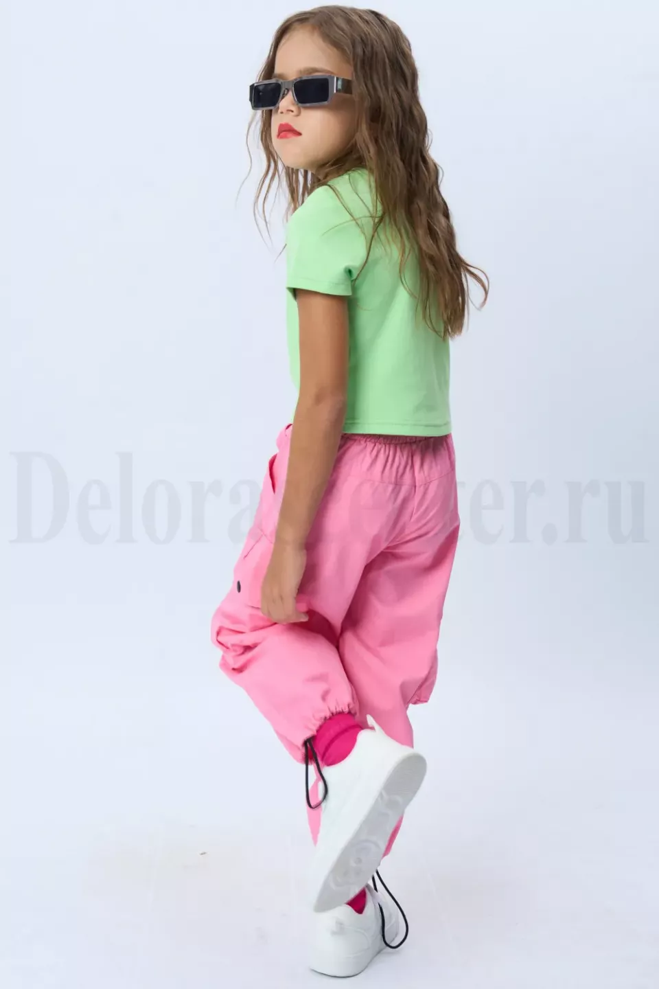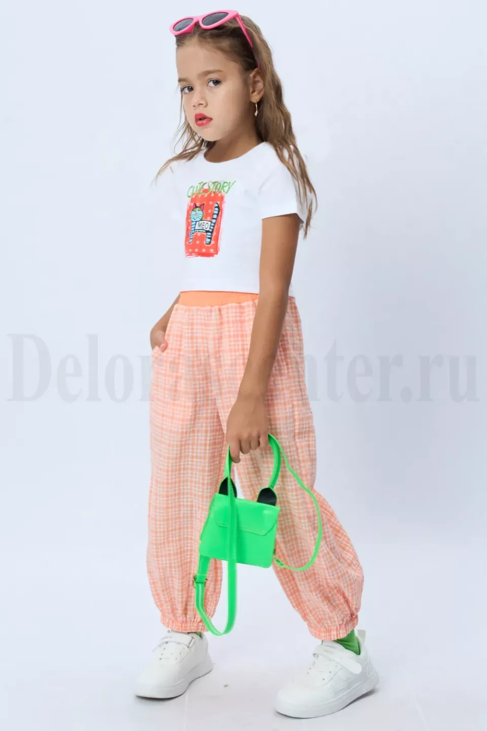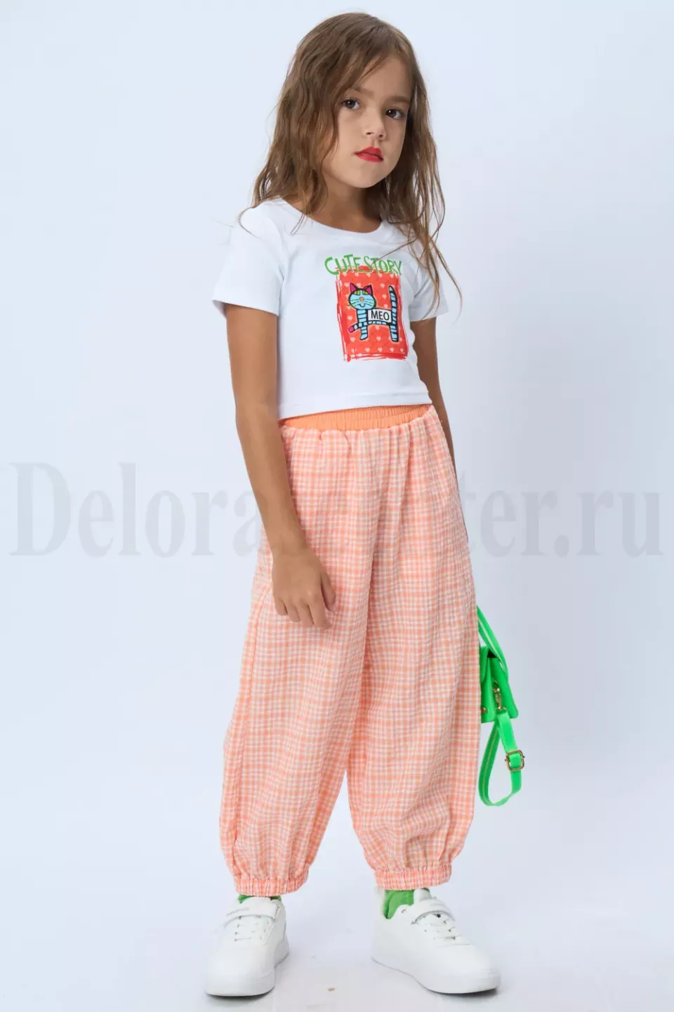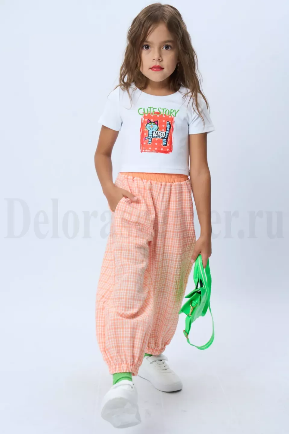 Летняя футболка для девочки сшита из хлопка с небольшим добавлением эластана. Это укороченная модель прямого покроя. Вырез круглый, рукава короткие и прямые. На груди забавный принт котика. Футболка достаточно универсальная, ее можно купить, чтобы носить с любыми шортами, брюками, юбками куда угодно.