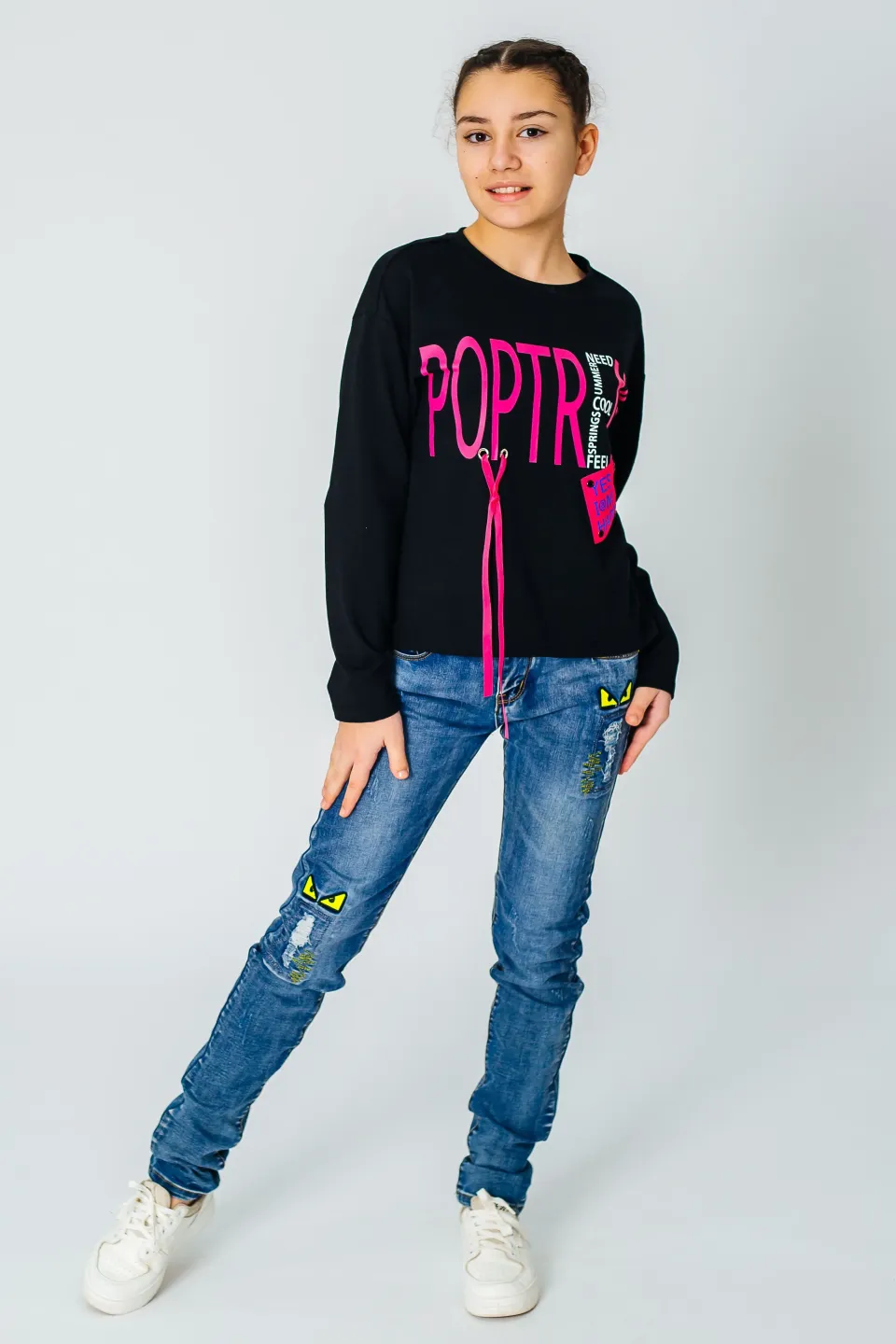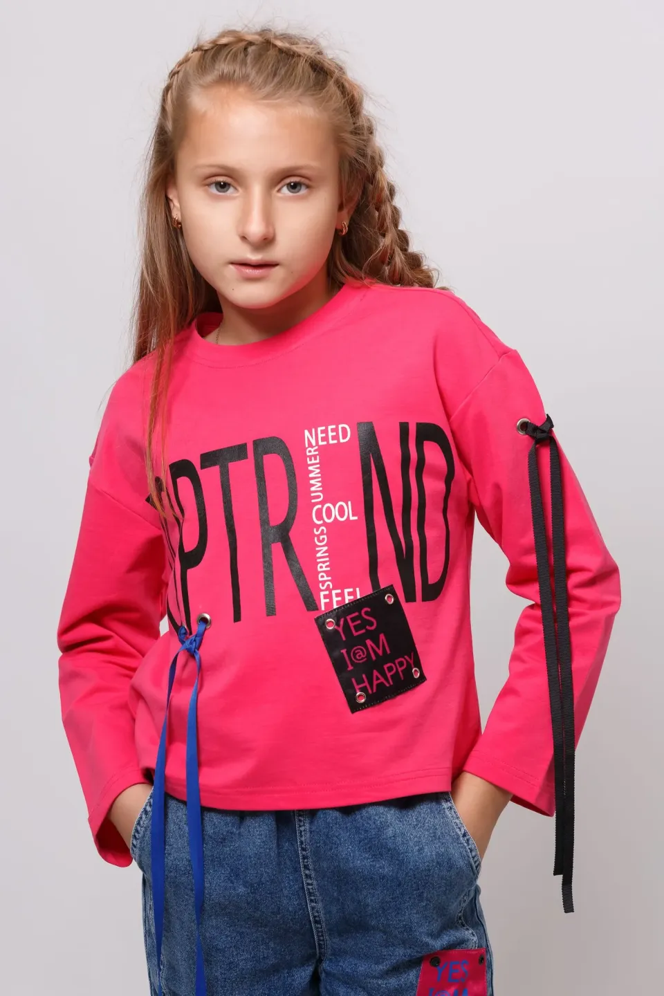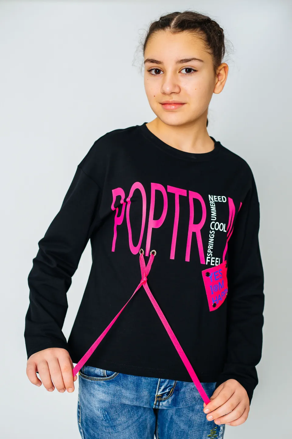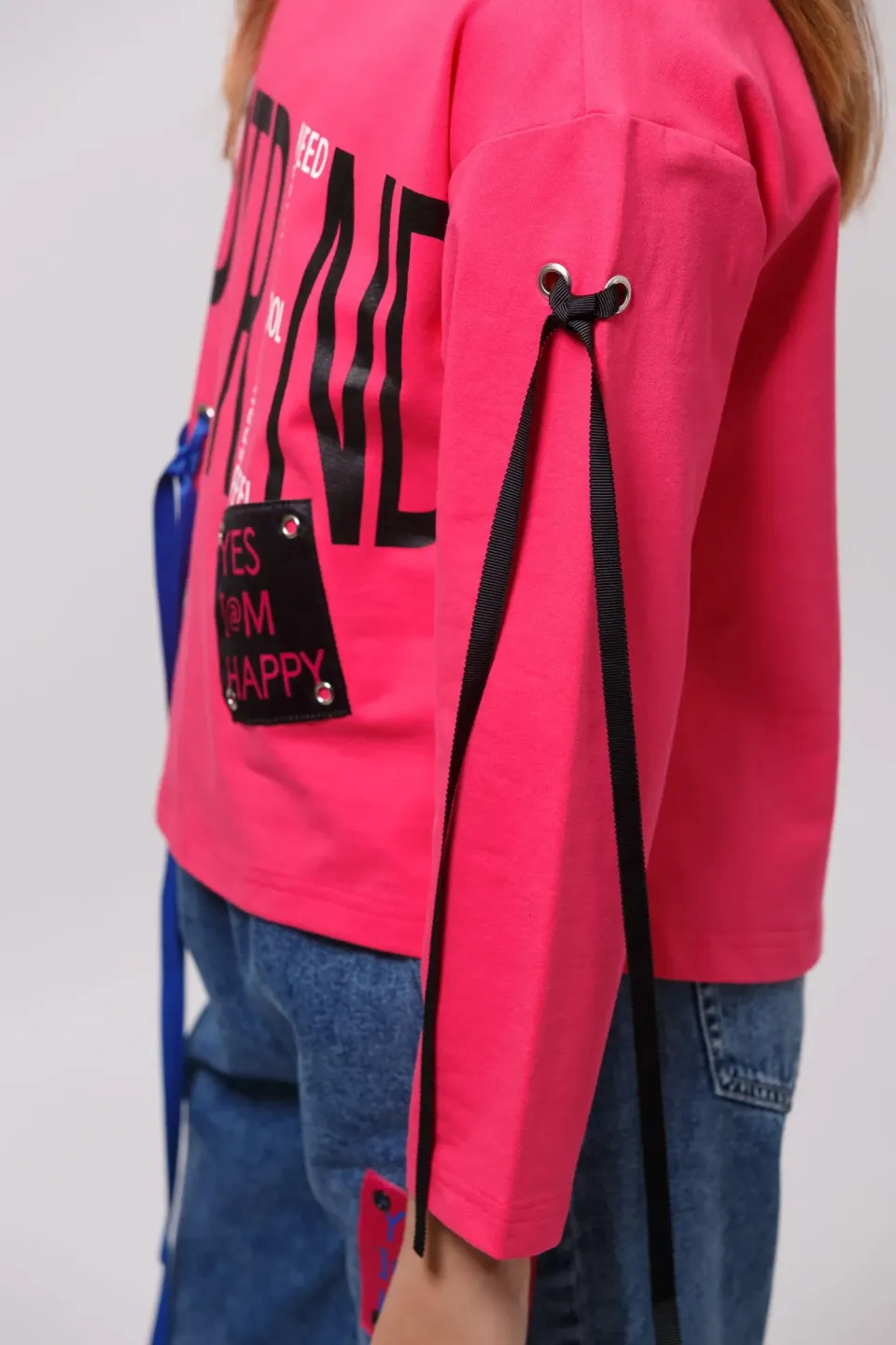 Свитшот свободного кроя для девочек. Изделие выполнено из высококачественного трикотажного полотна с большим содержанием хлопка и вискозы. У модели округлая горловина. Перед украшен принтом, нашивкой и декоративной тесьмой. Цвет ткани - черный, цвет принта и ленты - малиновый (также имеется синяя лента на рукаве).