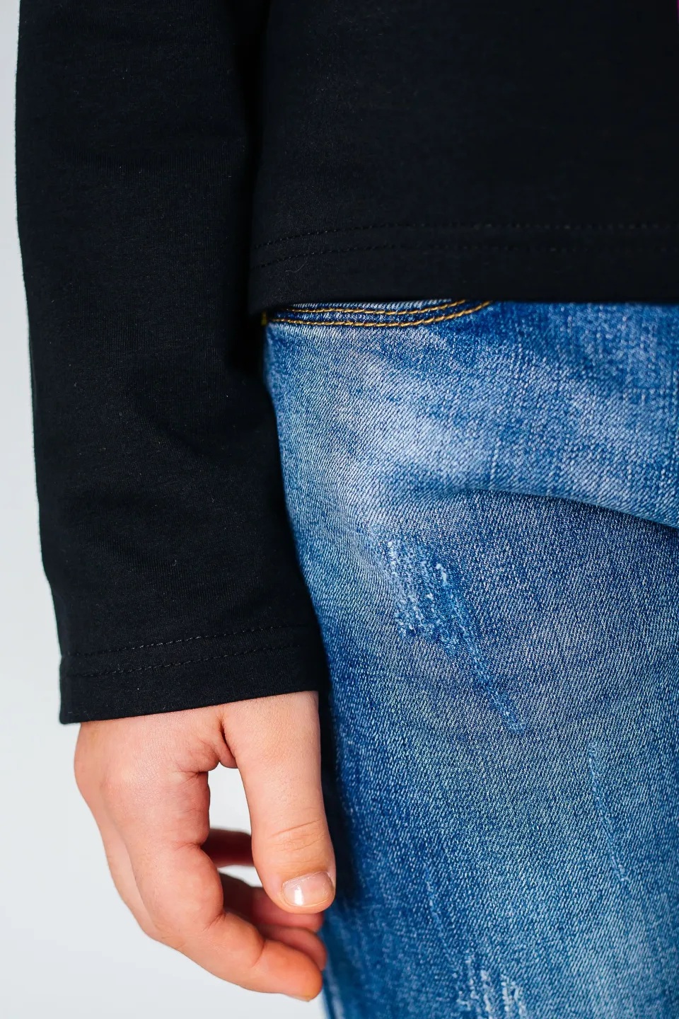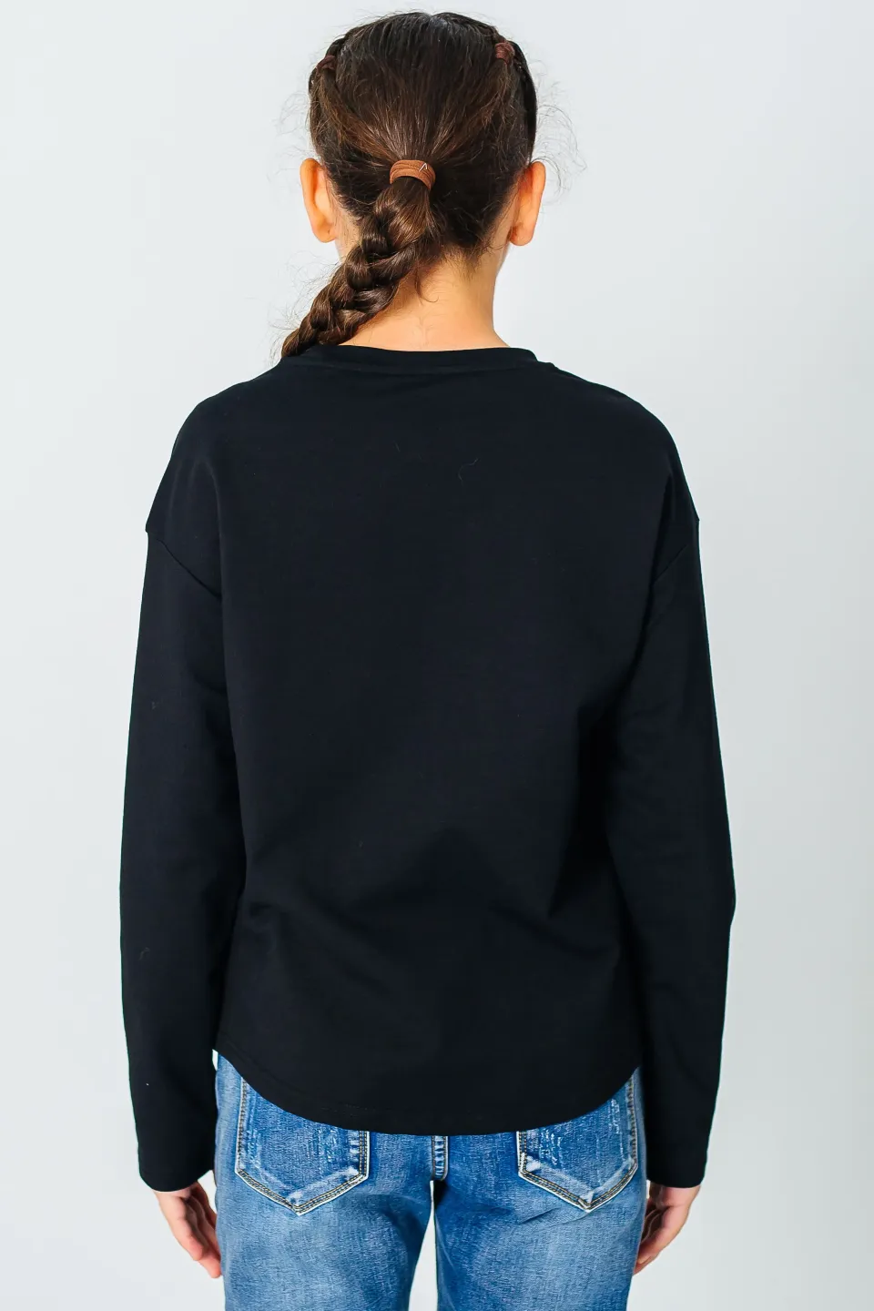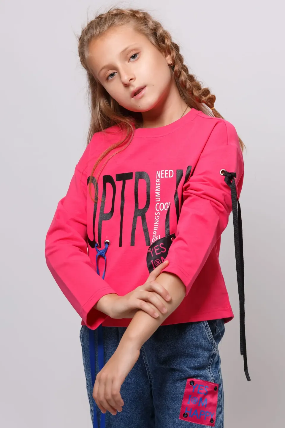 Свитшот свободного кроя для девочек. Изделие выполнено из высококачественного трикотажного полотна с большим содержанием хлопка и вискозы. У модели округлая горловина. Перед украшен принтом, нашивкой и декоративной тесьмой. Цвет ткани - черный, цвет принта и ленты - малиновый (также имеется синяя лента на рукаве).