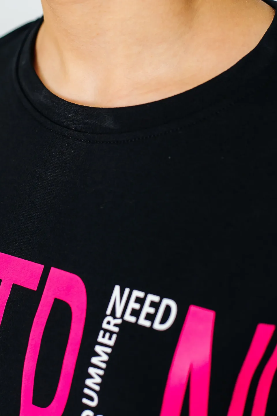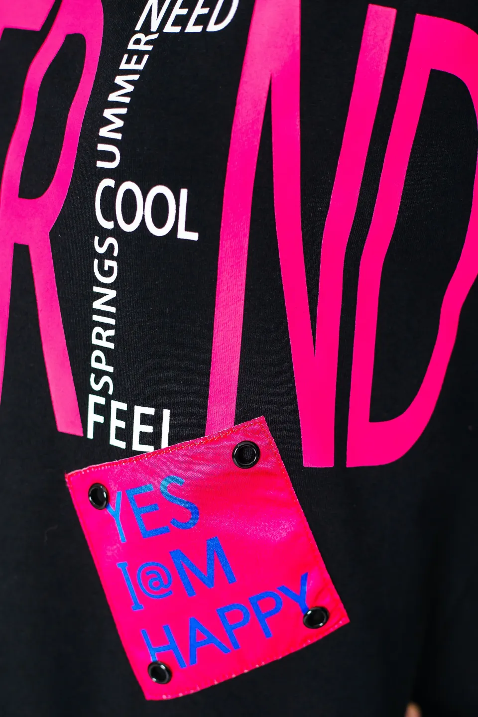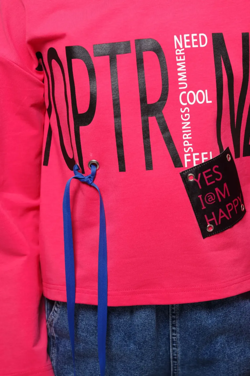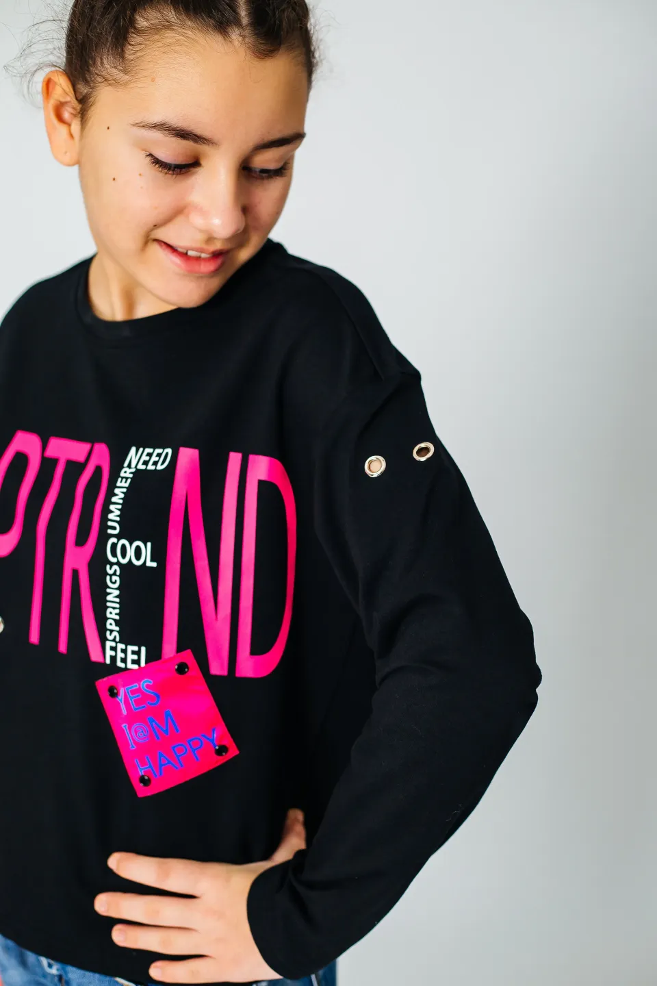 Свитшот свободного кроя для девочек. Изделие выполнено из высококачественного трикотажного полотна с большим содержанием хлопка и вискозы. У модели округлая горловина. Перед украшен принтом, нашивкой и декоративной тесьмой. Цвет ткани - черный, цвет принта и ленты - малиновый (также имеется синяя лента на рукаве).