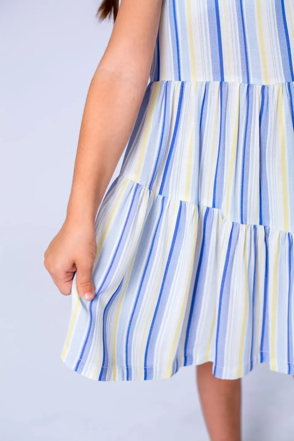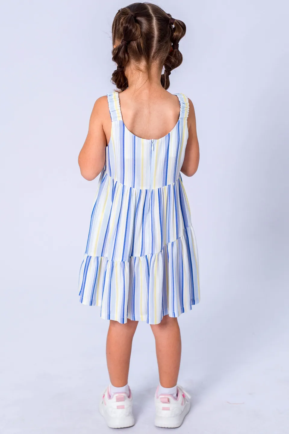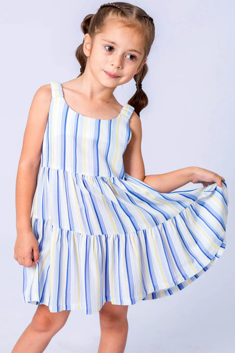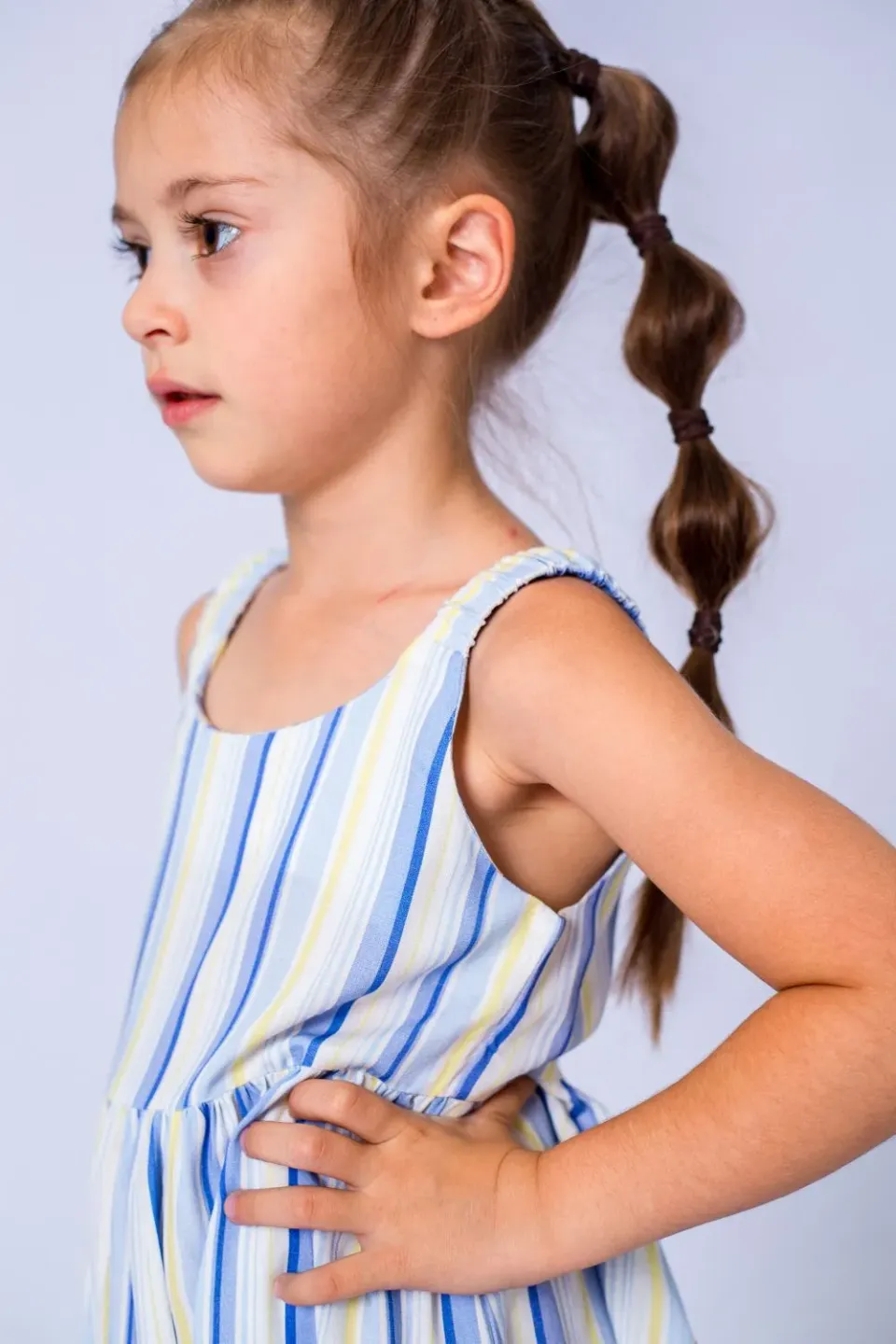 Летний сарафан для девочки сшит из 100% вискозы. Ткань не мнется, приятная к телу. Внимание привлекает рисунок в полоску и асимметричная оборка на подоле. Сарафан отрезной по талии, застегивается на молнию на спинке. Вырез средней глубины, округлый.. Бретели цельнокроенные, с вшитыми резинками.