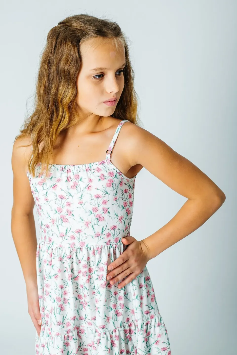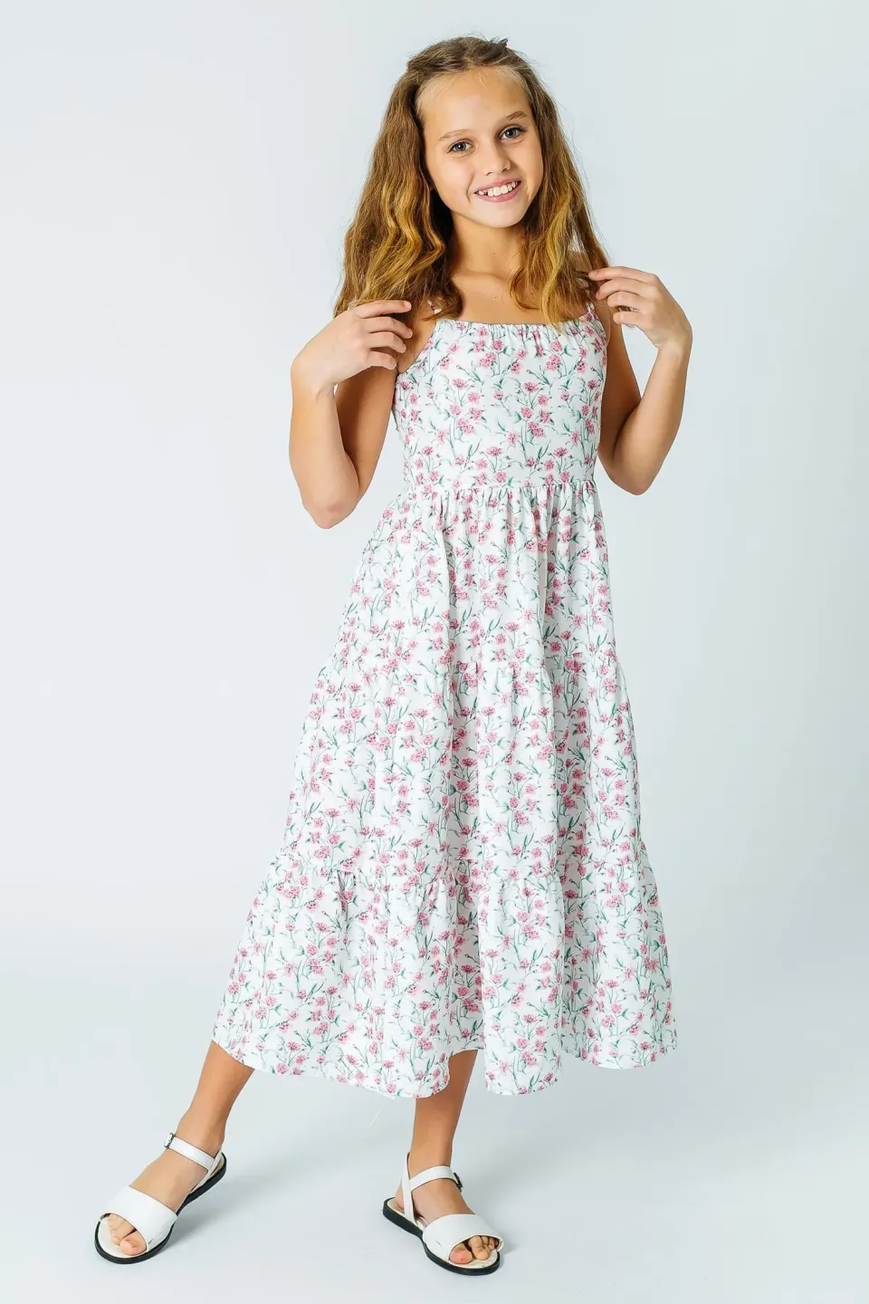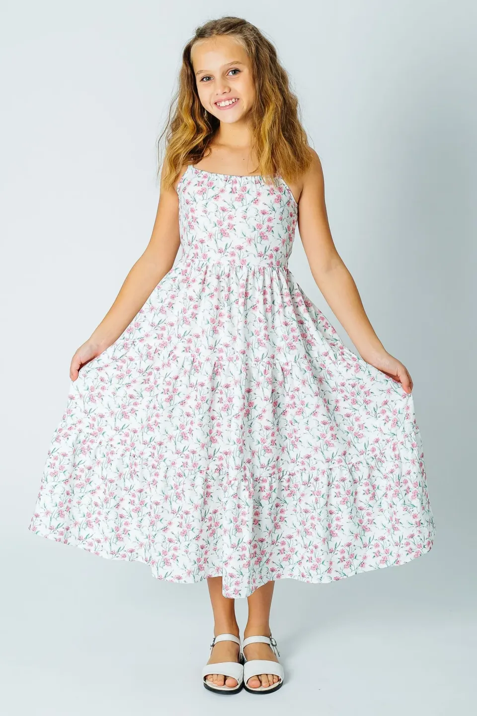 Летний сарафан макси для девочки сшит из легкой смесовой ткани с нежным цветочным рисунком. Оно длинное, до щиколотки. Фасон приталенный с широкой и расклешенной юбкой. Лиф с прямым вырезом и тонкими лямками. Купить этот романтичный сарафан можно для повседневного ношения в жаркие дни.