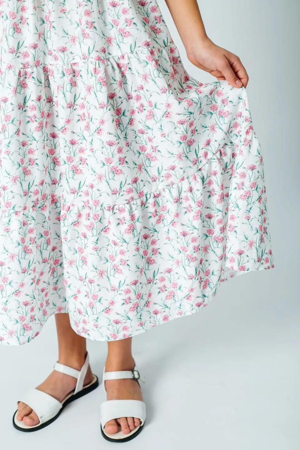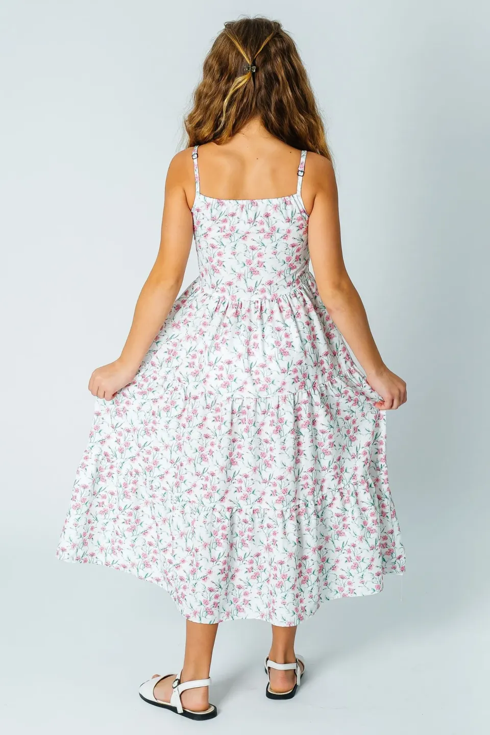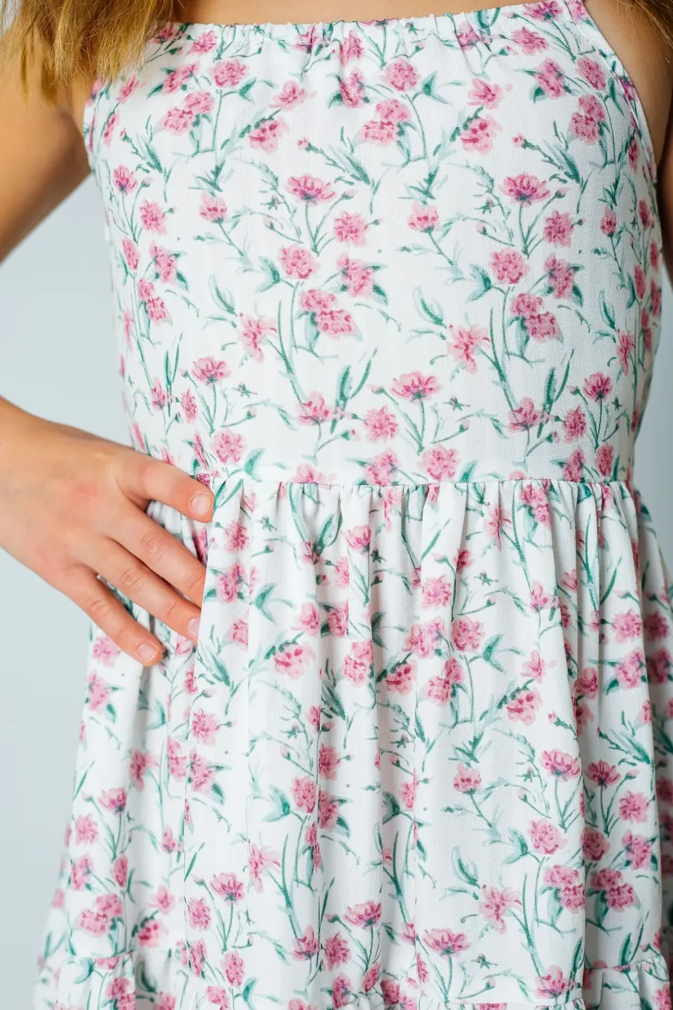Летний сарафан макси для девочки сшит из легкой смесовой ткани с нежным цветочным рисунком. Оно длинное, до щиколотки. Фасон приталенный с широкой и расклешенной юбкой. Лиф с прямым вырезом и тонкими лямками. Купить этот романтичный сарафан можно для повседневного ношения в жаркие дни.