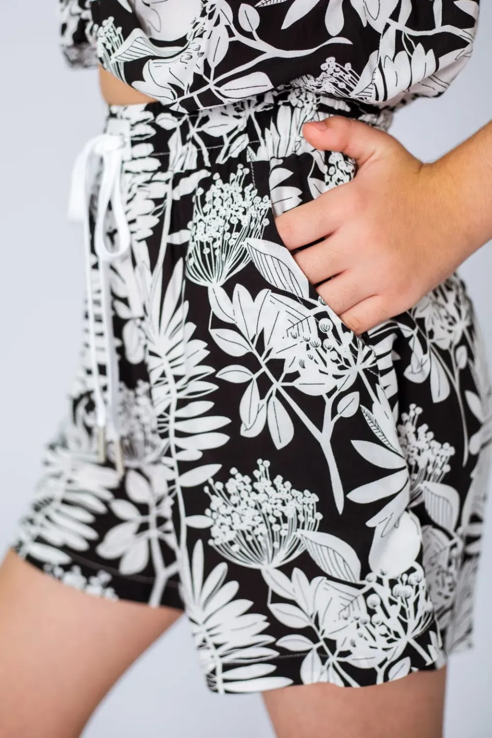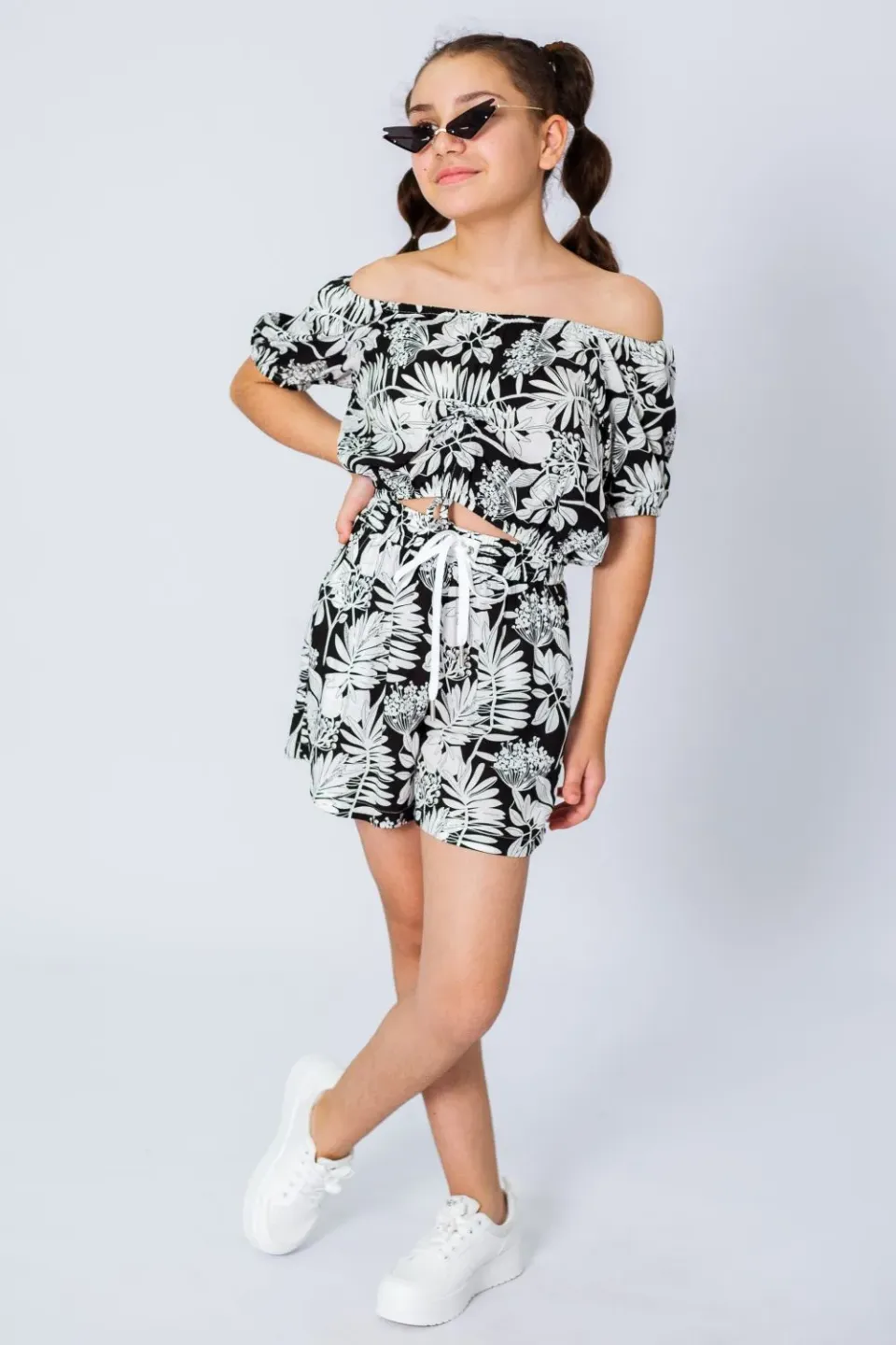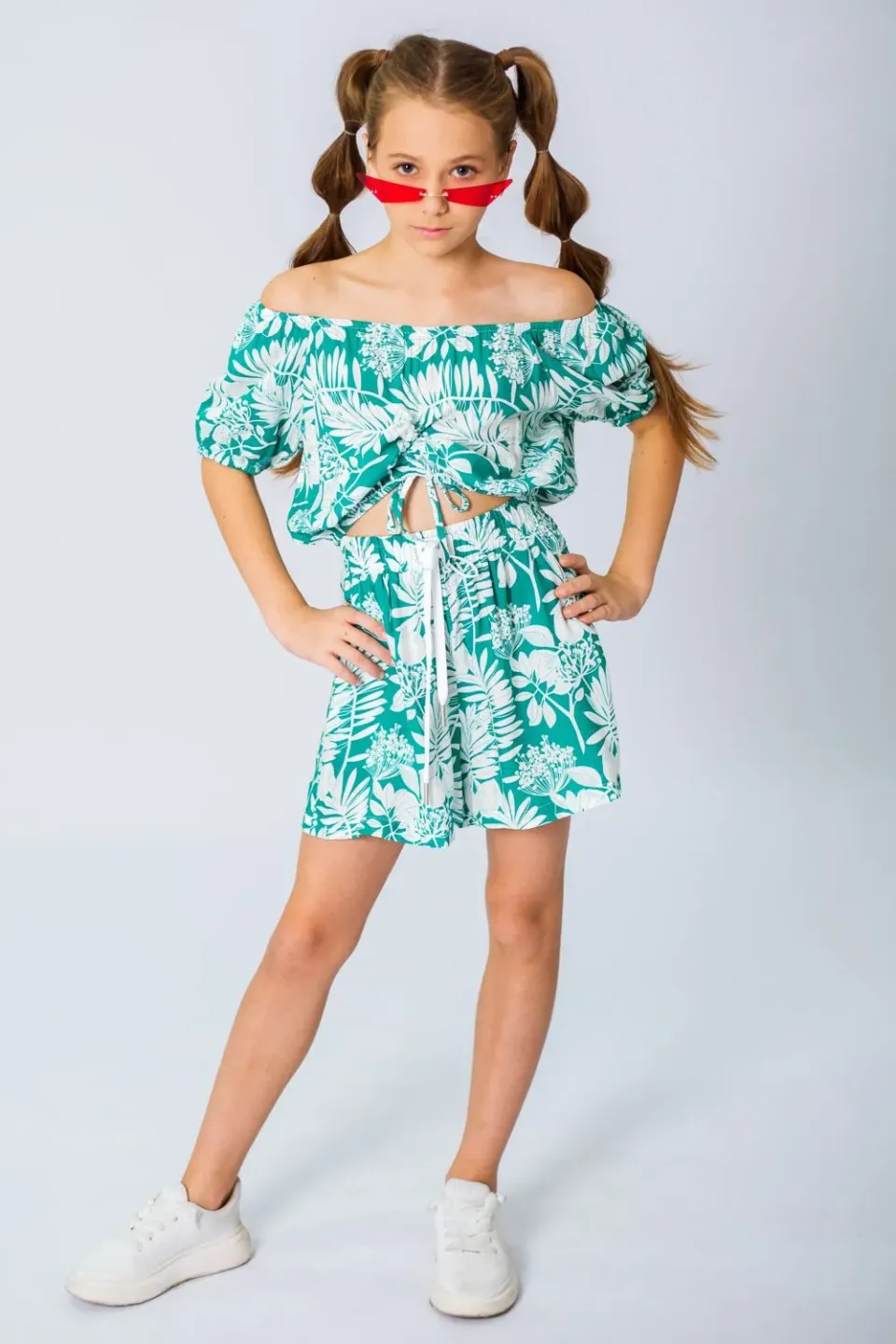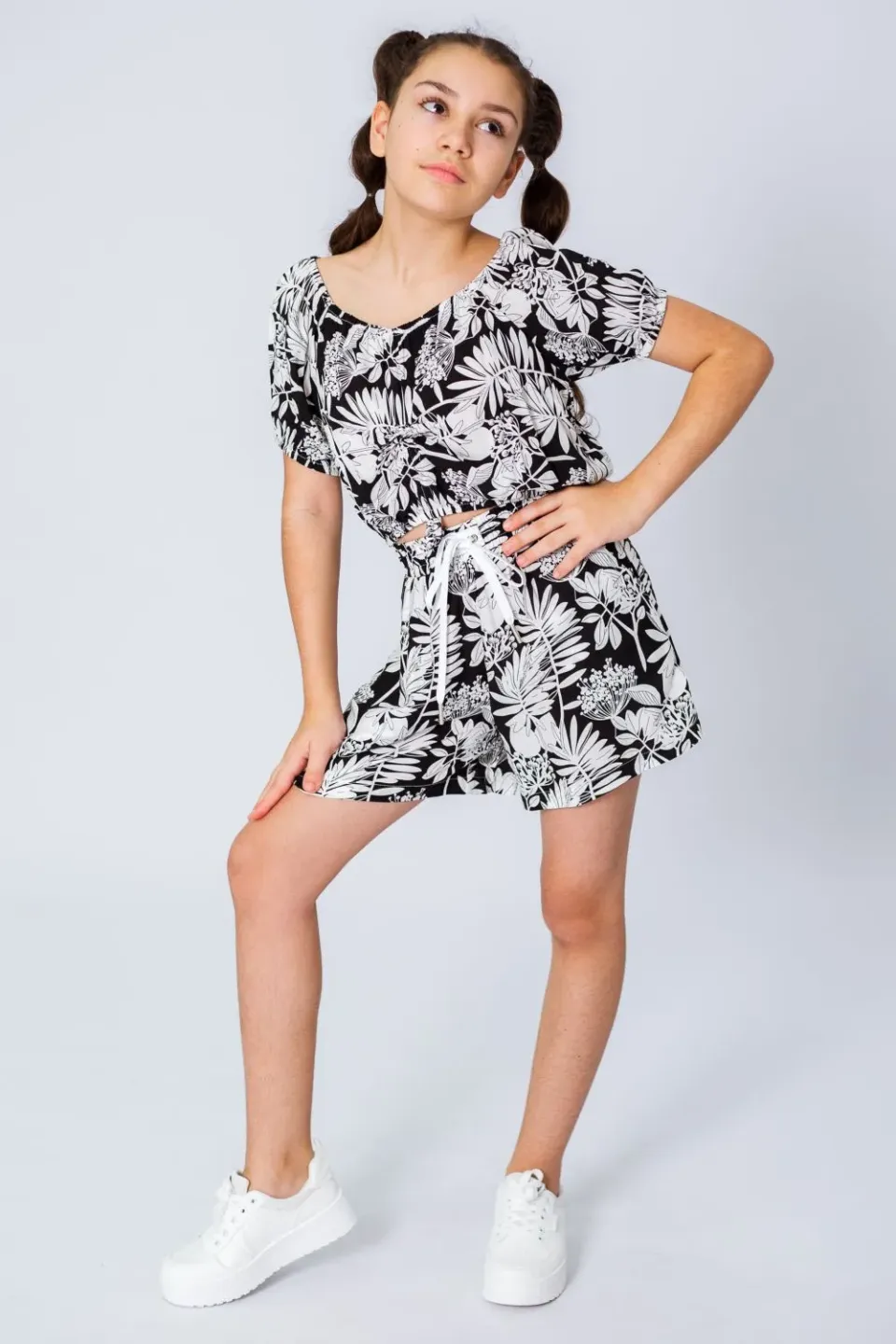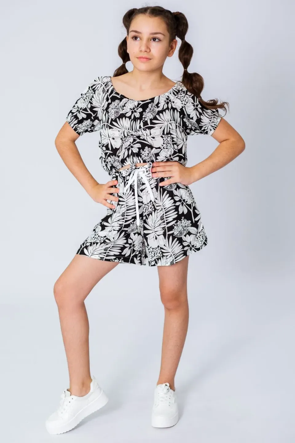 Летние шорты для девочки сшиты из приятной к телу вискозной ткани с ярким и крупным растительным рисунком. Шоры широкие, расклешенные, со штанинами средней ширины. Посадка высокая, пояс эластичный и с дополнительным шнуром для утяжки.