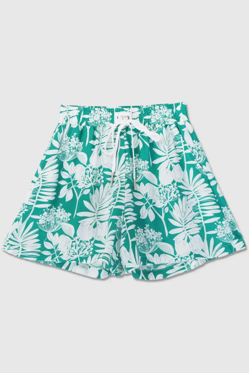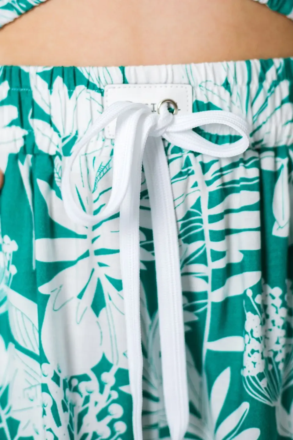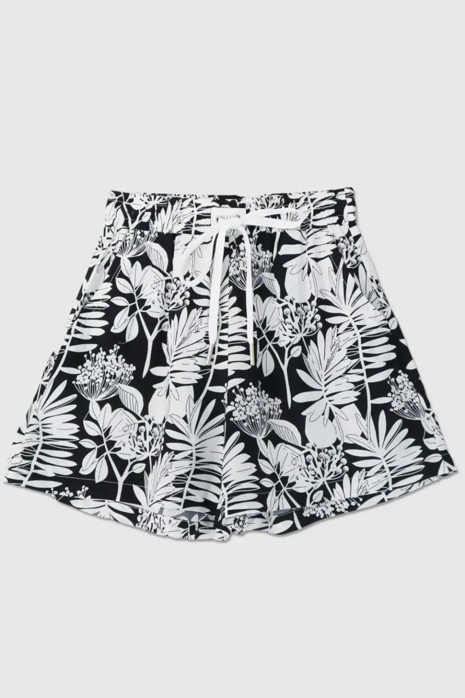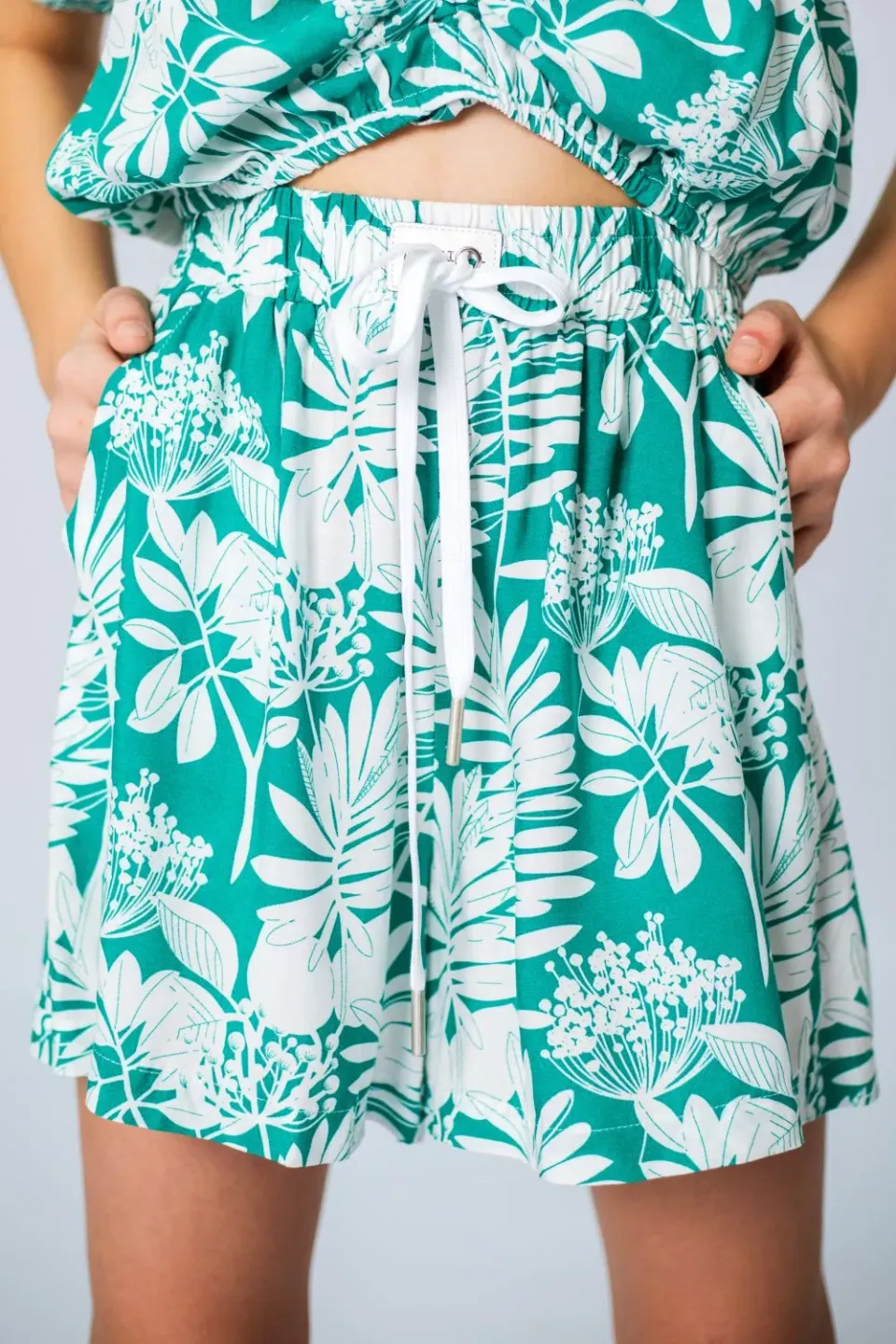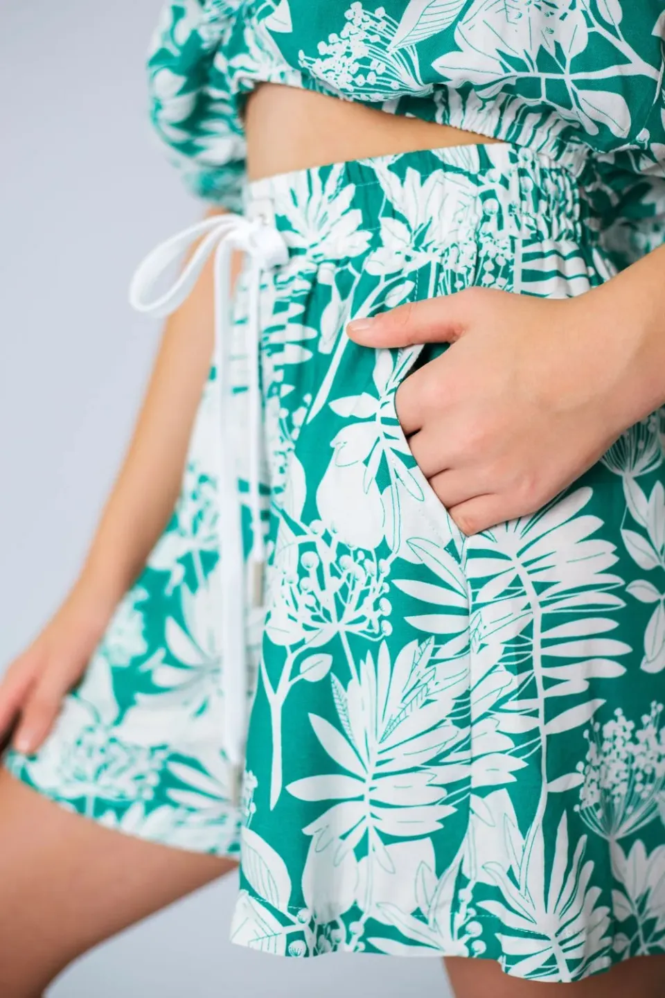 Летние шорты для девочки сшиты из приятной к телу вискозной ткани с ярким и крупным растительным рисунком. Шоры широкие, расклешенные, со штанинами средней ширины. Посадка высокая, пояс эластичный и с дополнительным шнуром для утяжки.