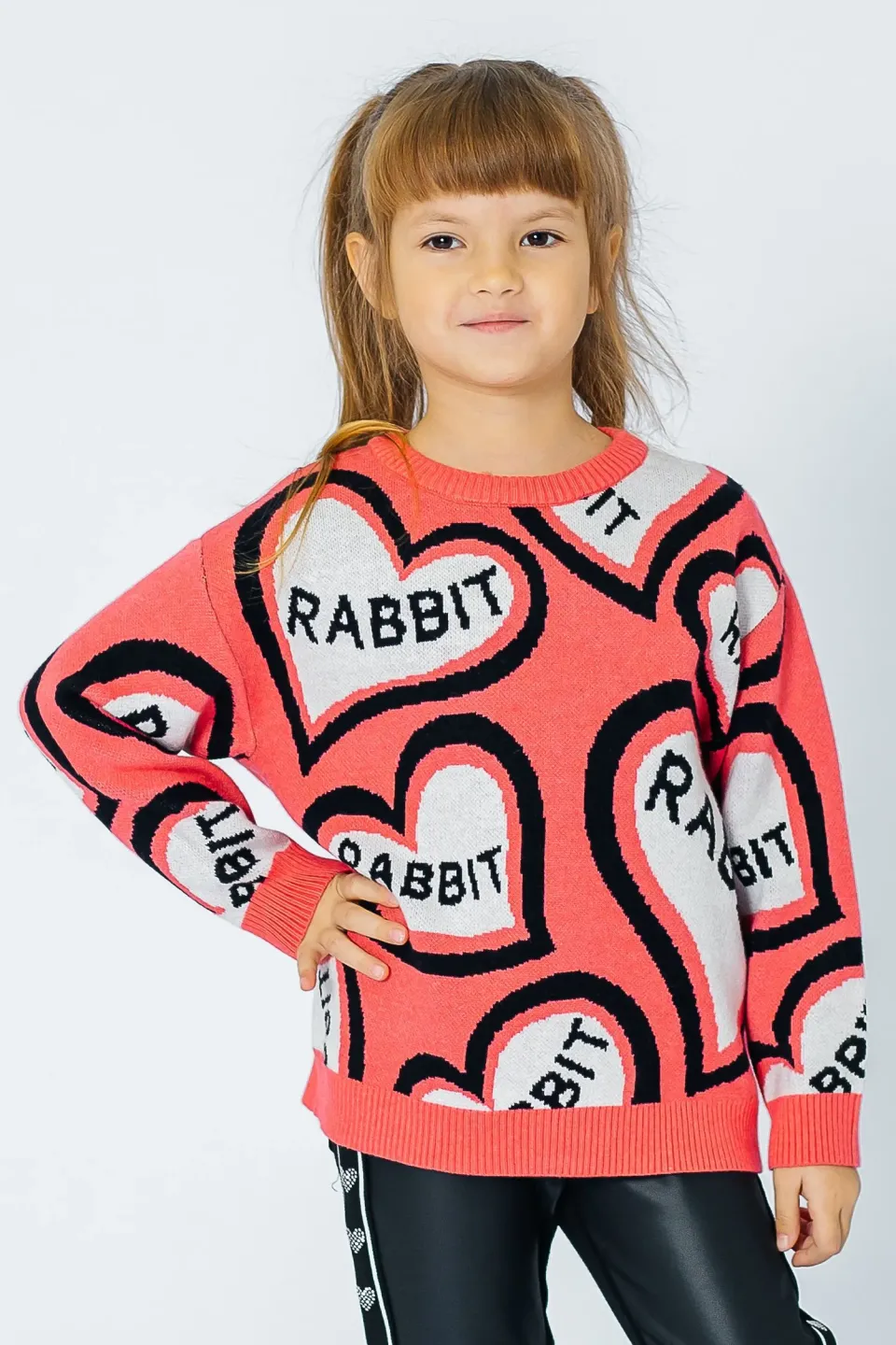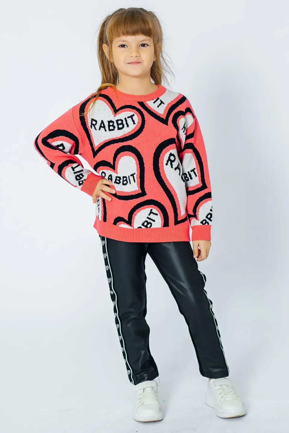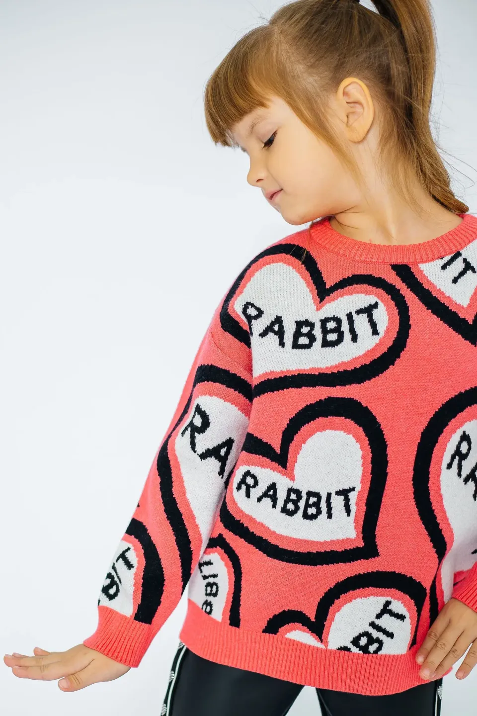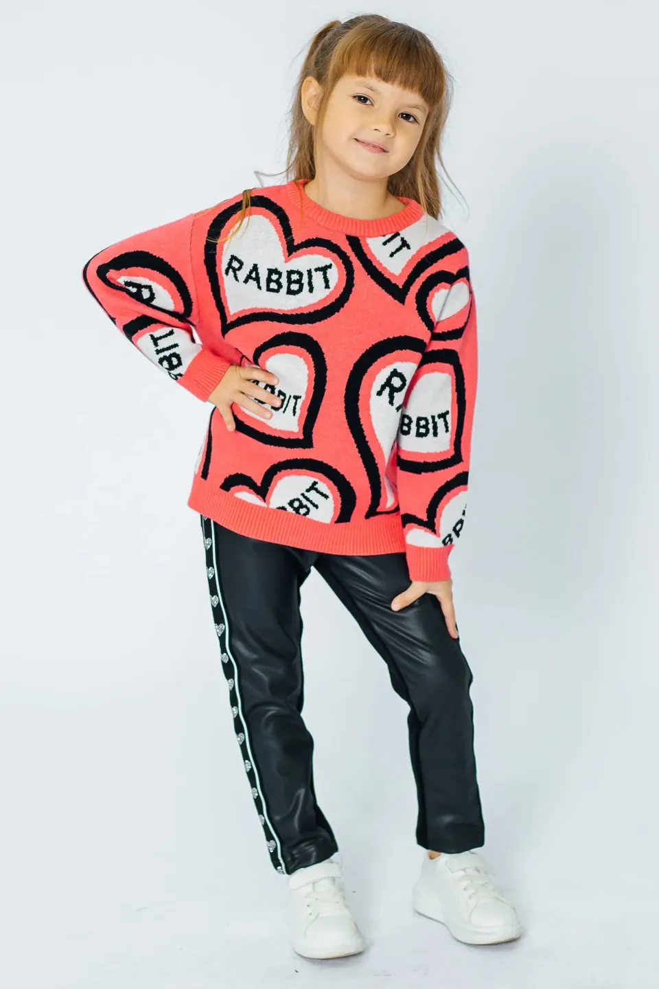 Джемпер классического покроя с эластичным поясом и манжетами эффектно смотрится за счёт крупного рисунка в виде сердец с чёрным контуром и надписями внутри. На спинке рисунка нет. Смесовая ткань на основе вискозы приятна к телу, не вытягивается и неприхотлива в уходе. Джемпер можно носить с лосинами, брюками, юбками.