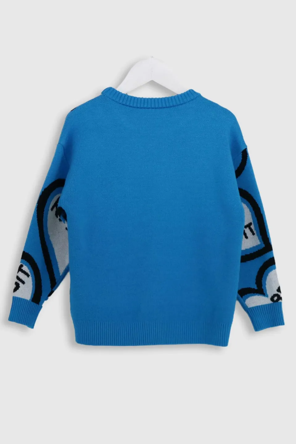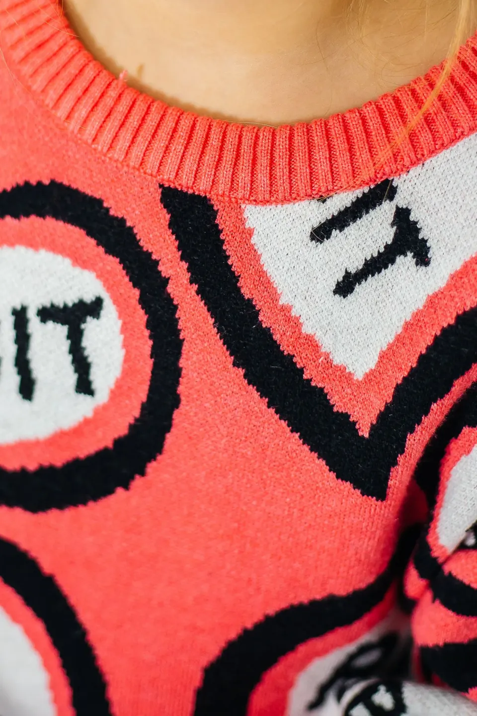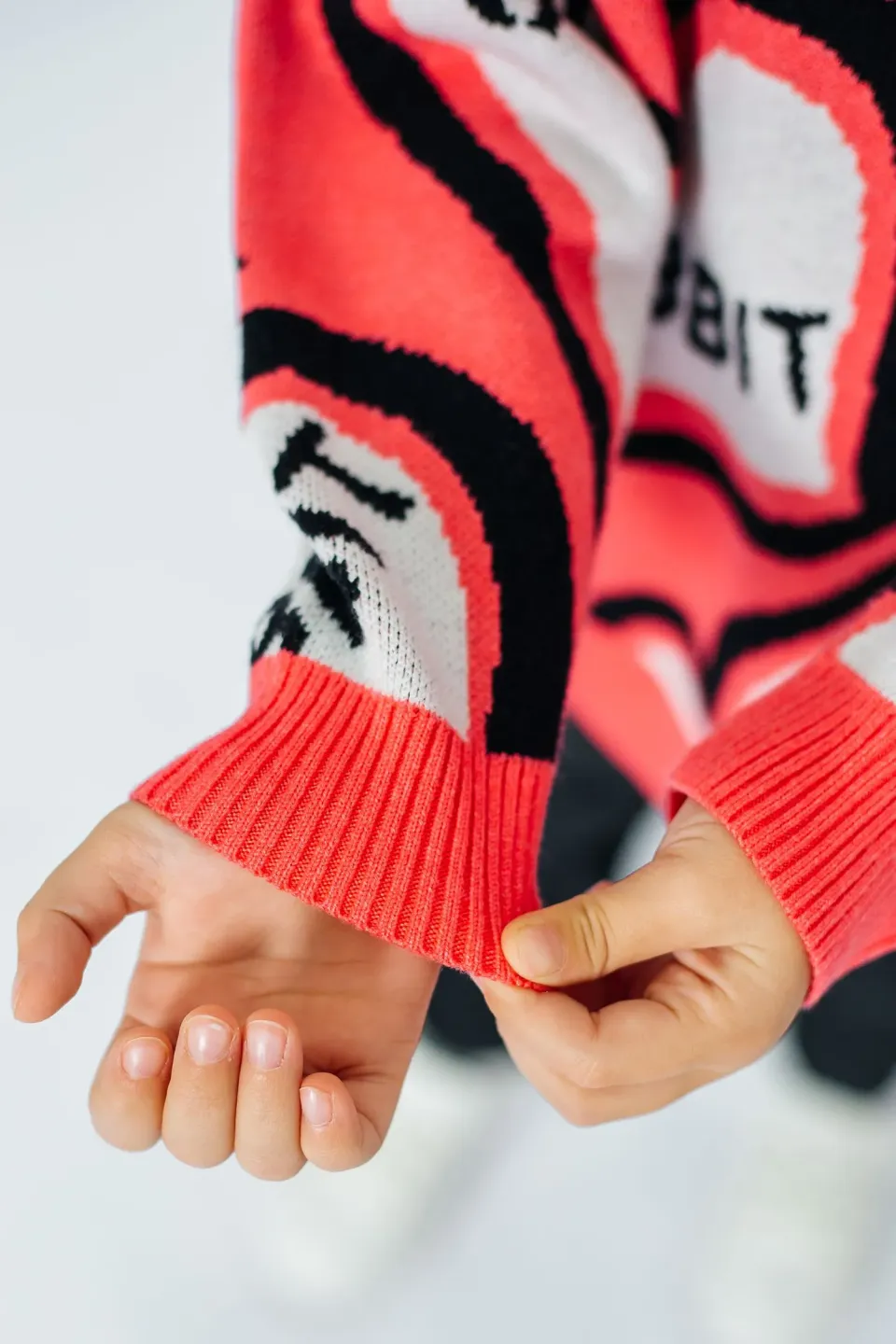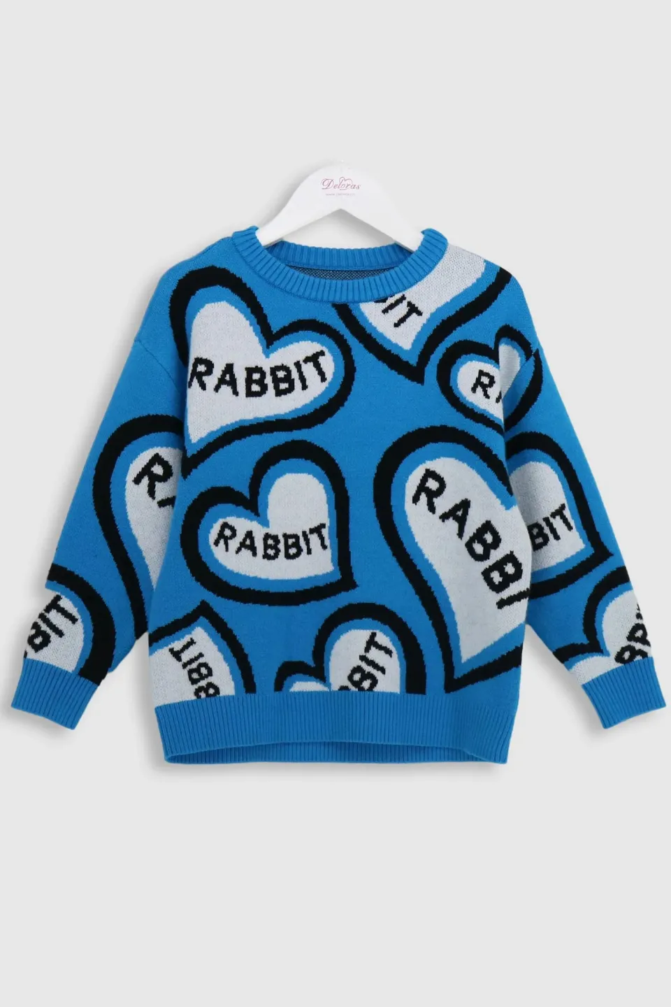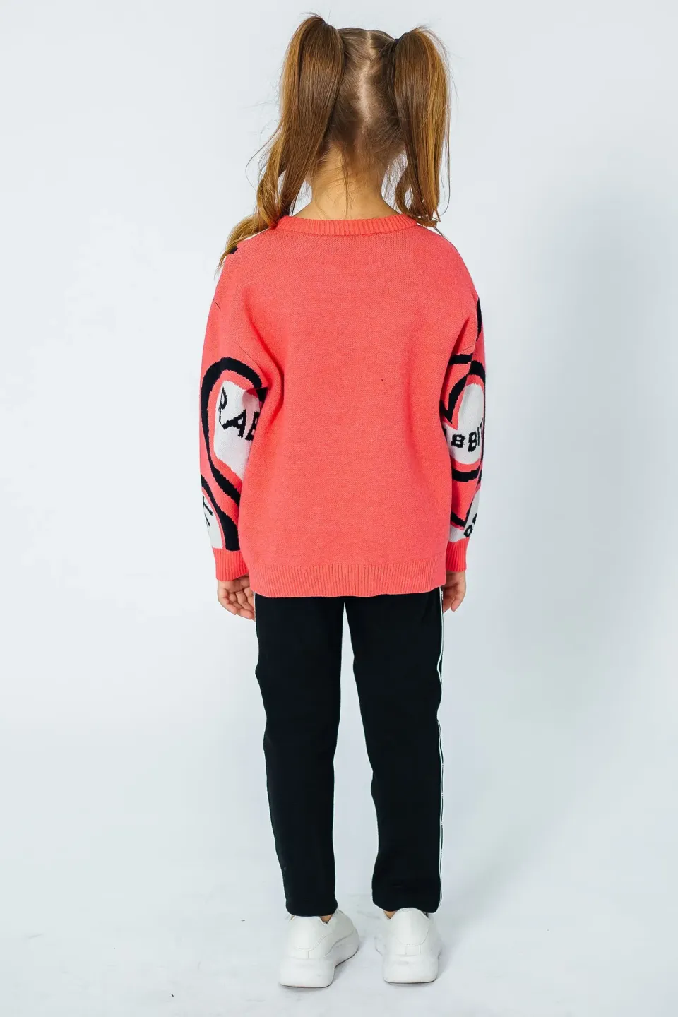 Джемпер классического покроя с эластичным поясом и манжетами эффектно смотрится за счёт крупного рисунка в виде сердец с чёрным контуром и надписями внутри. На спинке рисунка нет. Смесовая ткань на основе вискозы приятна к телу, не вытягивается и неприхотлива в уходе. Джемпер можно носить с лосинами, брюками, юбками.