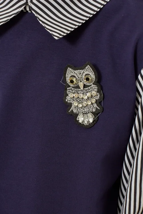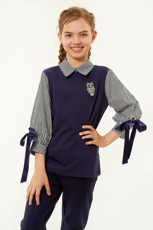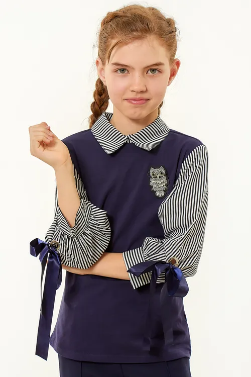Удлиненная блузка с полосатыми широкими рукавами и воротником. Рукава украшены длинными атласными лентами, завязывающимися в банты. На груди симпатичная нашивка совы с пайетками. Блузка имеет оригинальный, но в то же время довольно строгий вид и подходит для школы.