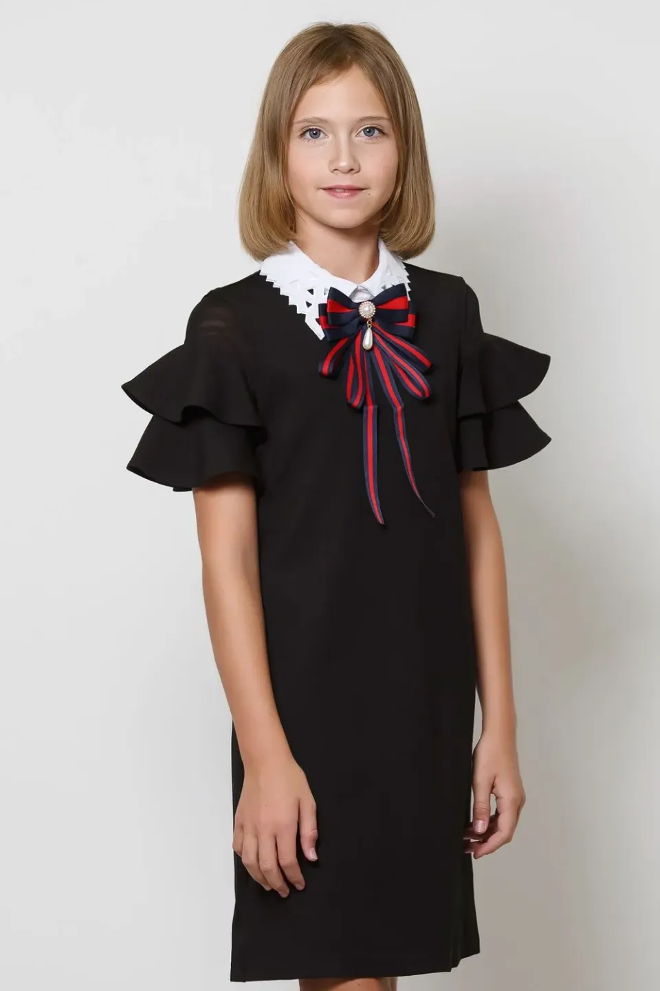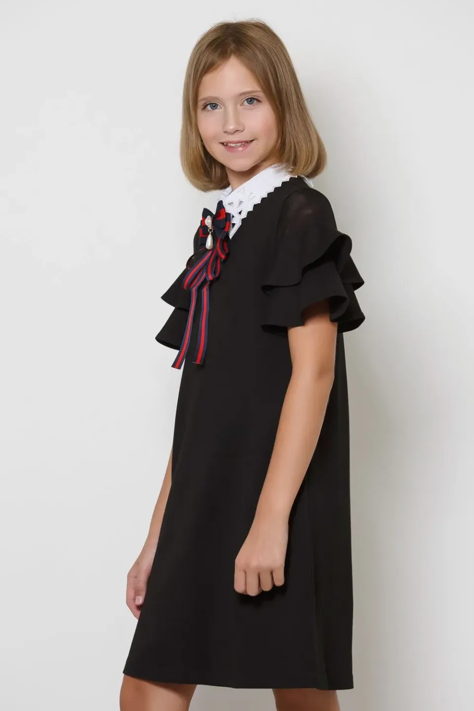 Платье свободного кроя для девочек. Изделие выполнено из высококачественного плотного трикотажа с большим содержанием вискозы. У модели съёмный отложной воротник. Рукава-крылышки декорированы сеткой в тон. Застёжка на пуговицу по среднему шву спинки.