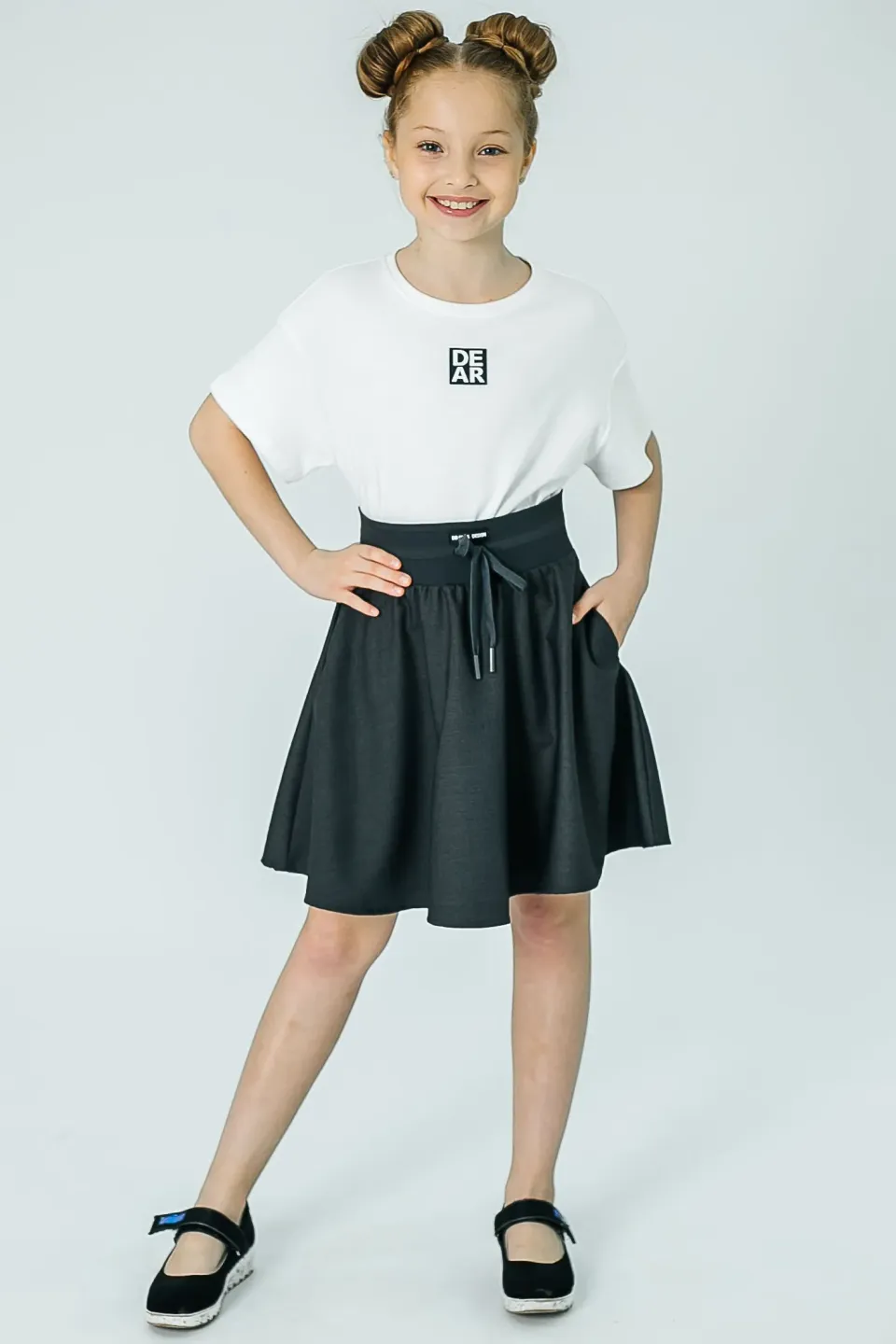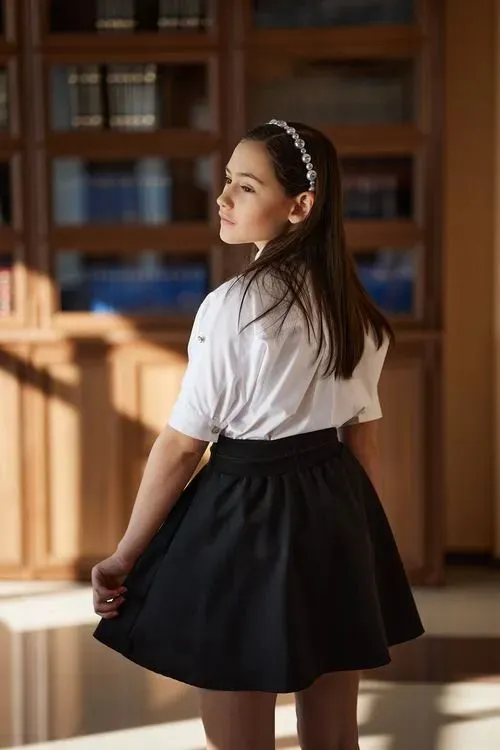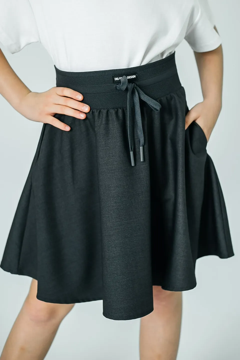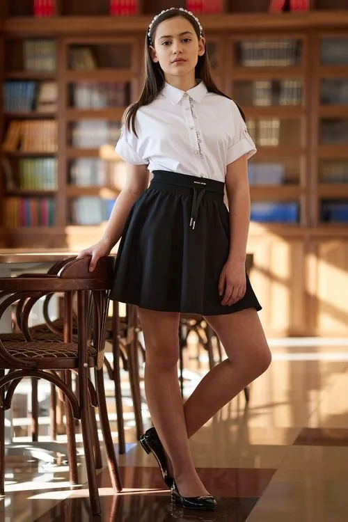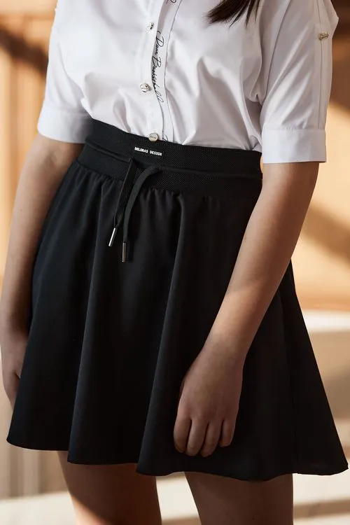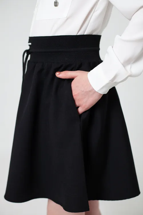 Школьная юбка для девочки сшита из практичной смесовой ткани, содержащей 55% вискозы. У неё высокая посадка, пояс на резинке и со шнуром для утяжки. Юбка коротка, пышная, с мягкими складками.. Хорошо смотрится слюбыми блузками и водолазками.