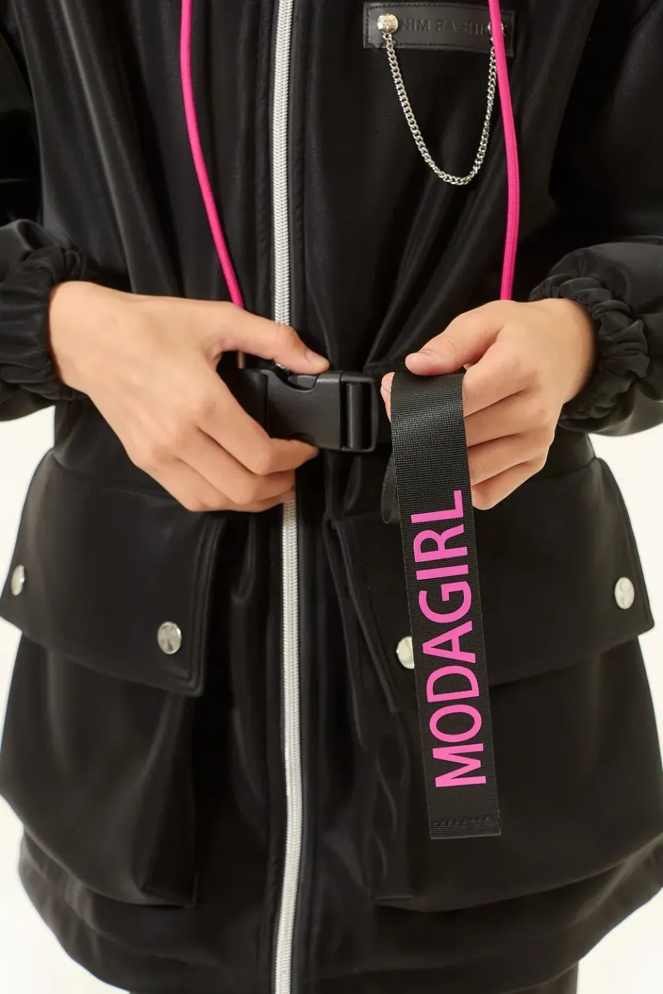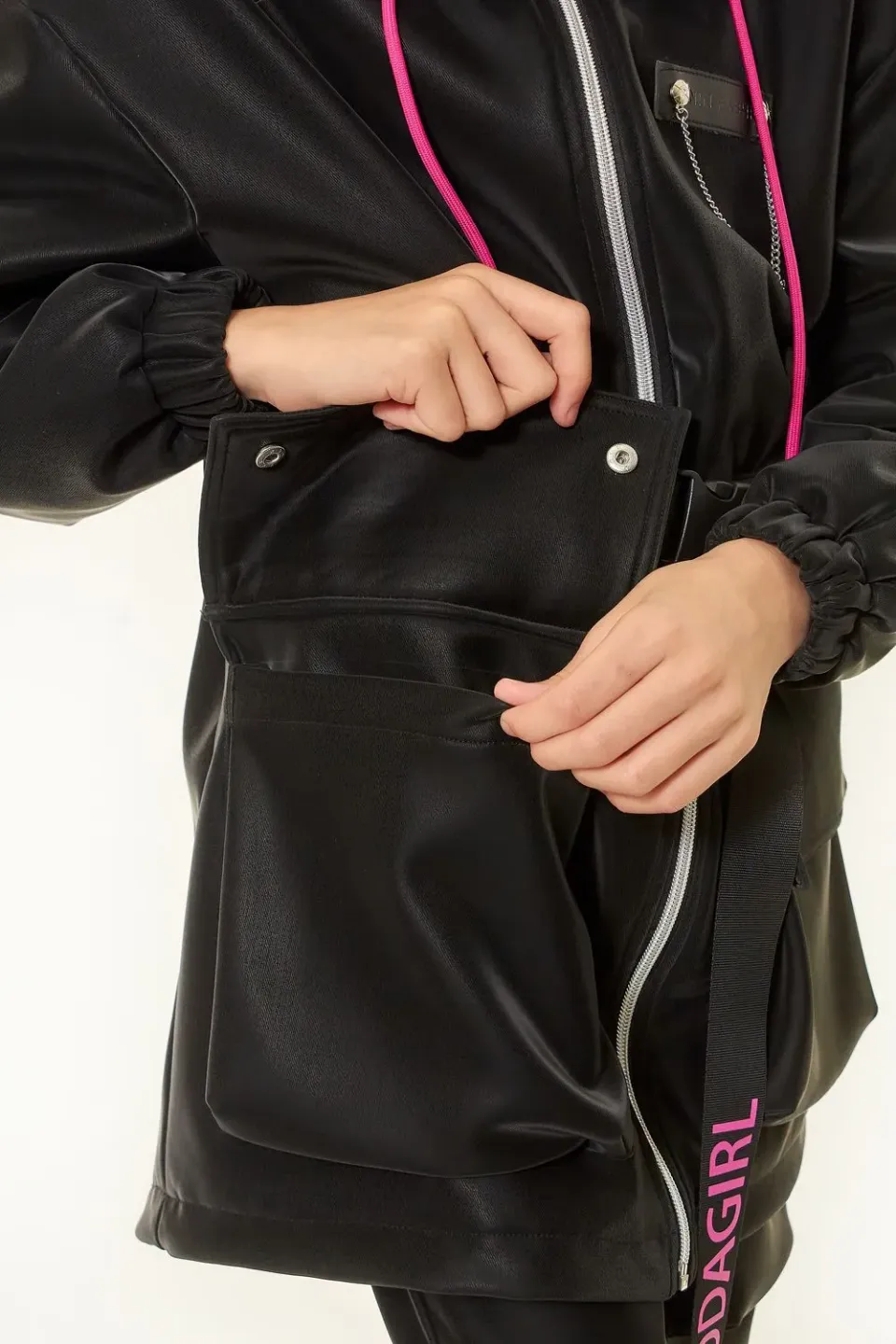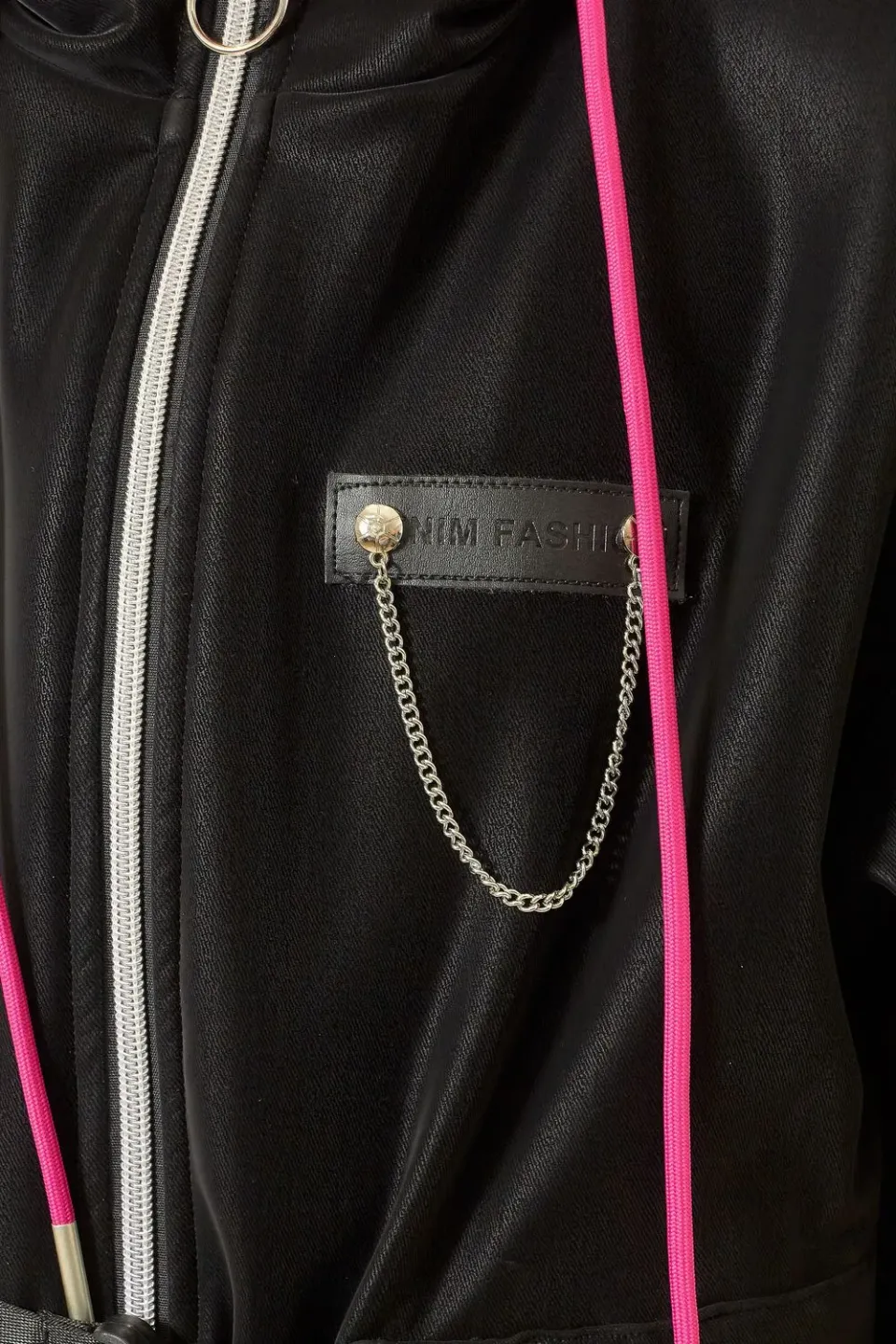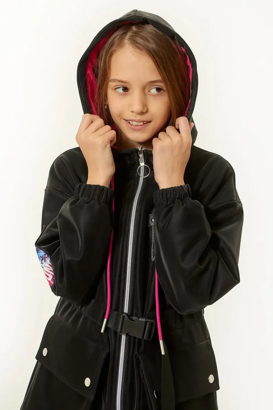 Стильная куртка для девочки-подростка. Декорирована яркими вставками, резко контрастирующими на основном черном фоне куртки. Интересной деталью, требующей отдельного внимания, является аккуратная цепь, на вставке слева в области груди. Куртка данной модели — та самая вещь, которая должна быть в арсенале у каждой активной модницы.