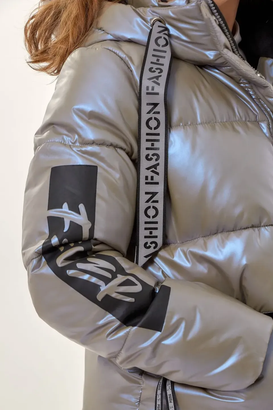 - Низ пальто украшен лентой с текстовым принтом.