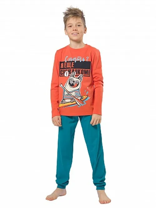 Пижама PELICAN для мальчика обеспечит комфорт ребенку во время сна. Пижама состоит из кофты прямого кроя без манжет и круглым воротом и штанов на резинке и с манжетами. Кофта украшена изображением собаки на лодке и надписей.