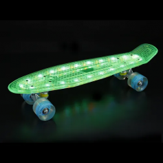 Этот маленький манёвренный скейтборд подойдёт для детей от 3 до 6 лет. Рельефная поверхность предотвращает скольжение. Пенни борд светится целиком, как колёса, так и дека, что выгодно выделяет его на фоне аналогов и привлекает внимание. Дека выполнена из высококачественного пластика. Полиуретановые колеса обеспечивают хорошее сцепление с поверхностью, быстрый разгон и торможение.