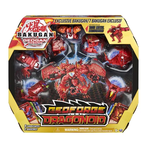 Трансформер Драгоноид состоит из 6 эксклюзивных Геоганов и одного редкого Драгоноида Тру Металл. Редкий Драгоноид Бакуган с металлическими деталями - самый мощный Бакуган в битве - способен на невероятную трансформацию. В комплекте 6 карт способностей, карта ворот и карта персонажа.