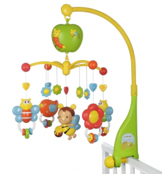 - игрушки, прикрепленные к мобилю, поворачиваются по кругу. Пытаясь следить за ними глазами, малыш учится фокусировать взгляд на объекте;