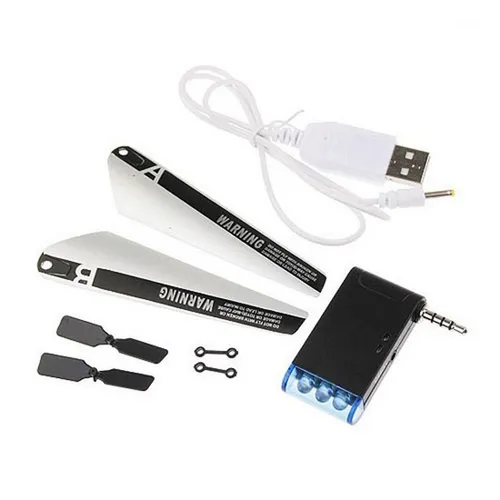 Комплект: вертолет, передатчик, 2 запасные основные лопасти, 2 запасных хвостовых пропеллера, USB кабель, инструкция.