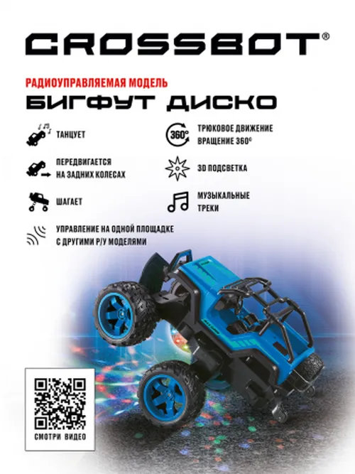 Стильная, современная машина-бигфут на радиоуправлении «Диско» двигается вперёд и назад, поворачивает вправо и влево, осуществляет оригинальное трюковое движение на задних колёсах, шагает и вращается на 360 градусов. Игра сопровождается динамичным звучанием музыкальных треков и красивой 3D-подсветкой.