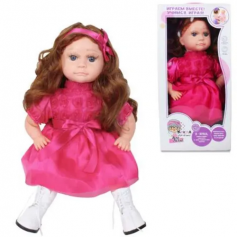 - Кукла одета в нарядное малиновое платье с воротником-стойкой, короткими рукавами на резинке и пышной юбкой до колен с завязывающимся на бантик поясом. У нее высокие белые сапоги на шнуровке и интересные интерактивные возможности.