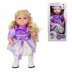 В комплекте также есть красивое лиловое платье с оборками и ремешком, на ножках у игрушки белые сапожки, а длинные светлые волосы украшены фиолетовой повязкой.