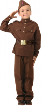 Ваш ребенок очень хочет посетить парад и другие мероприятия в честь 9 мая? Или может он принимает участие в спектакле или постановке номера на военную тему? Карнавальный костюм Солдат очень похож на советскую военную форму времен Великой Отечественной войны. Этот образ вызывает только положительные эмоции, помогает помнить и гордиться историей своей Родины. В комплект входит гимнастерка с ремнем, штаны, пилотка.