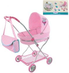 Люлька, которой снабжена коляска, изготовлена из плотного текстильного материала и дополнена нежным принтом в горошек. У люльки имеется большой капюшон, который поможет уберечь куклу от негативных воздействий окружающей среды, таких как солнечные лучи или осадки. В комплекте также можно найти удобную сумочку, идеально подходящую к коляске по стилю и цветовому исполнению.