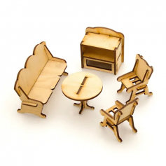 Гостиная для кукольного домика Теремок. Набор подходит для кукол 10-12 см. В него входят: диван, 2 кресла, журнальный столик, тумба, телевизор.