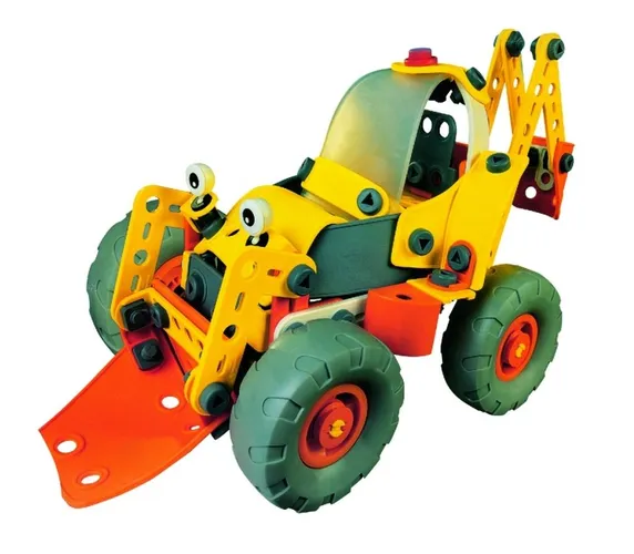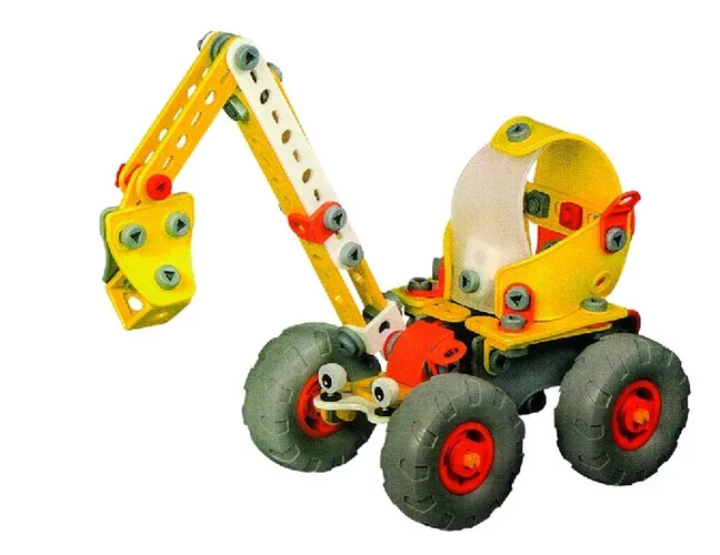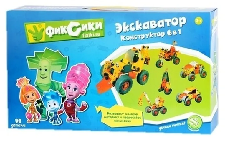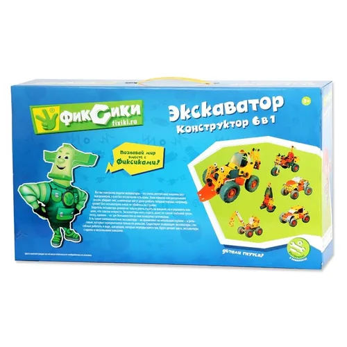 Фиксики - это маленькие человечки, которые живут в каждом доме, но вот только люди их никогда не видят. А всё потому, что эти малыши умеют превращаться в винтики, тем самым скрываясь от людского взора. Они обязательно помогут поскорее собраться вашему конструктору! Конструктор 6 в 1 позволяет собрать экскаватор, машину, мотоцикл и много чего ещё. На упаковке есть описательный блок про экскаваторы. Детали конструктора крупные, сделаны из пластика и резины, они гнутся.