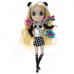 У куколки Мики длинные светлые прошитые волосы и большие серые глаза. Мики одета в черно-серебристую кофту с капюшоном и аппликацией панды и черную юбку в белый мелкий цветочек. На ногах черные гольфы с мордочками панды и туфельки. Высота игрушки 33 см.