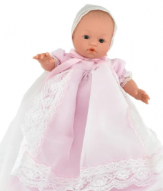 Пупсы являются одними из самых любимых и популярных игрушек для детей во всем мире. Эти куклы похожи на младенцев, за которыми нужно ухаживать. Чудесные пухлые щечки и складочки на теле вызывают умиление. Кукла понравится маленькой "маме", и она с удовольствием станет заботиться о своем малыше. Каждая девочка будет счастлива, получив в подарок пупса от испанской кукольной фабрики Carmen Gonzalez! Кукла-пупс "Мончи" выполнен из комбинированных материалов: туловище мягконабивное, а ручки, ножки и голова полностью виниловые с прорисовкой пальчиков и складок на них. Волосы у пупса нарисованные (молдированные), ресницы отсутствуют. Глазки у малыша серые, не закрываются. На личике прорисованы брови, а легкий румянец на щеках придает ему естественность. Ротик слегка приоткрыт. Пупс одет в необыкновенно нарядное, длинное платье из хлопка с рукавами-фонариками, декорированное кружевной лентой, белые панталоны и нарядный чепчик. Высота: 34 см.
