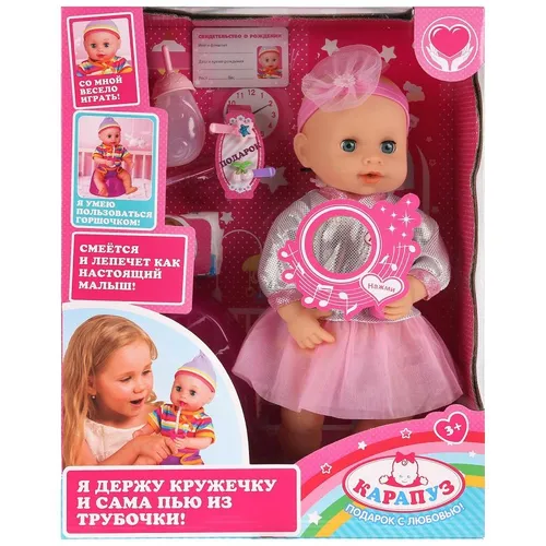 - Кроме того кукла смеется и лепечет как настоящий малыш, сама держит в руке кружку и пьет из трубочки.