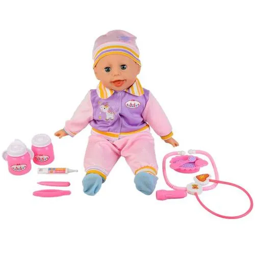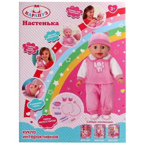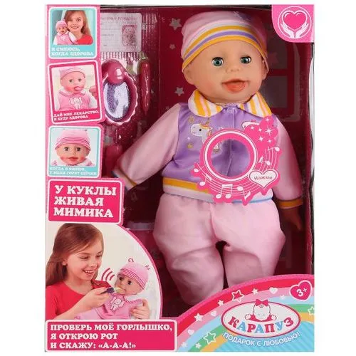 Куколка функциональна, у нее живая мимика, когда Настенька болеет, у неё горят щёчки, смеётся когда здорова. Дай Настеньке лекарство и малышка будет здорова, проверь горлышко, куколка откроет рот и скажет: “А-А-А!”, закрывает глазки. Настенька одета в модный комбинезончик с закрытыми ножками и шапочку с ушками. Одежду легко снять и надеть. У куколки мягкое тело, его приятно обнимать и убаюкивать. Когда кукольная малышка захочет спать, положи её в кроватку. Она закроет глазки и сладко уснёт.