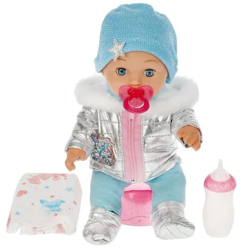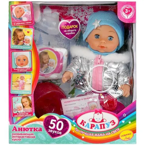 Этот милый пупс, с детально проработанным личиком, обязательно понравится вашей малышке. Анютка одета в милый зимний комбинезончик серебристого цвета. На голове у куклы голубая шапочка. Одежда легко снимается и надевается. С Анюткой девочка может играть в самые разные игры, гулять с ней, петь пе