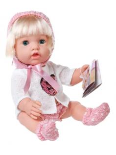Эта очаровательная куколка-пупс выглядит как настоящий малыш. Она умеет пить воду и писать. У нее есть соска, бутылочка, любимая игрушка "Кошечка". Куколка-блондинка одета в белую кофточку с сердечком из пайеток, ажурные шортики, розовую шапочку. Кукла упакована в подарочную красивую коробку.