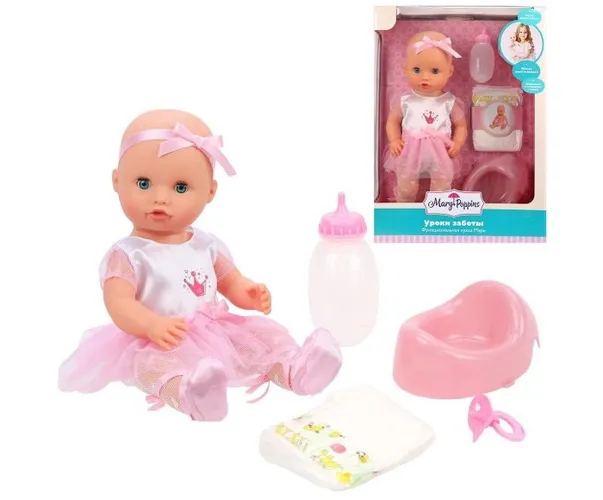 В состав набора включены следующие аксессуары: бутылочка, горшок, подгузник и соска-пустышка. Куколка одета в прелестное платье с юбочкой из фатина, на ножках у нее ажурные белые колготки и розовые атласные пуанты.