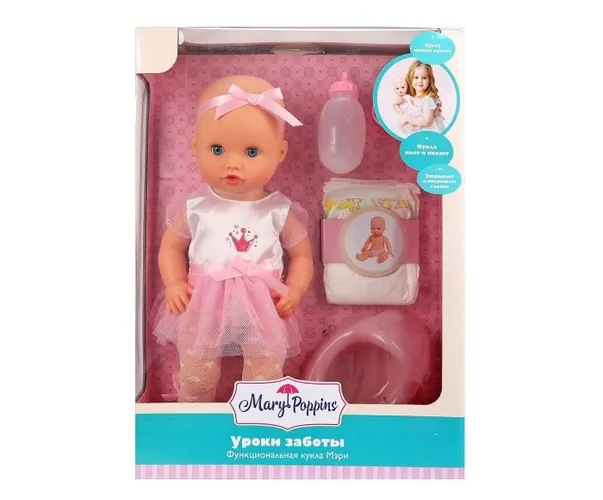 Кукла Мэри-балерина из коллекции "Уроки воспитания" внешне очень похожа на настоящего малыша! И так же, как и каждому маленькому ребенку, ей очень нужны внимание, любовь и забота. Эта милая девочка очень послушная: ее легко приучить к гигиене, достаточно напоить куколку из бутылочки водой, а затем посадить на розовый горшок. У малышки твердое тельце, ее можно купать. Глазки закрываются в положении «лежа» и открываются в положениях «стоя» и «сидя».