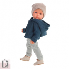 - Наряд куклы состоит из светлых штанишек и синей кофточки с капюшоном, которые дополнены ботиночками со шнурками.
