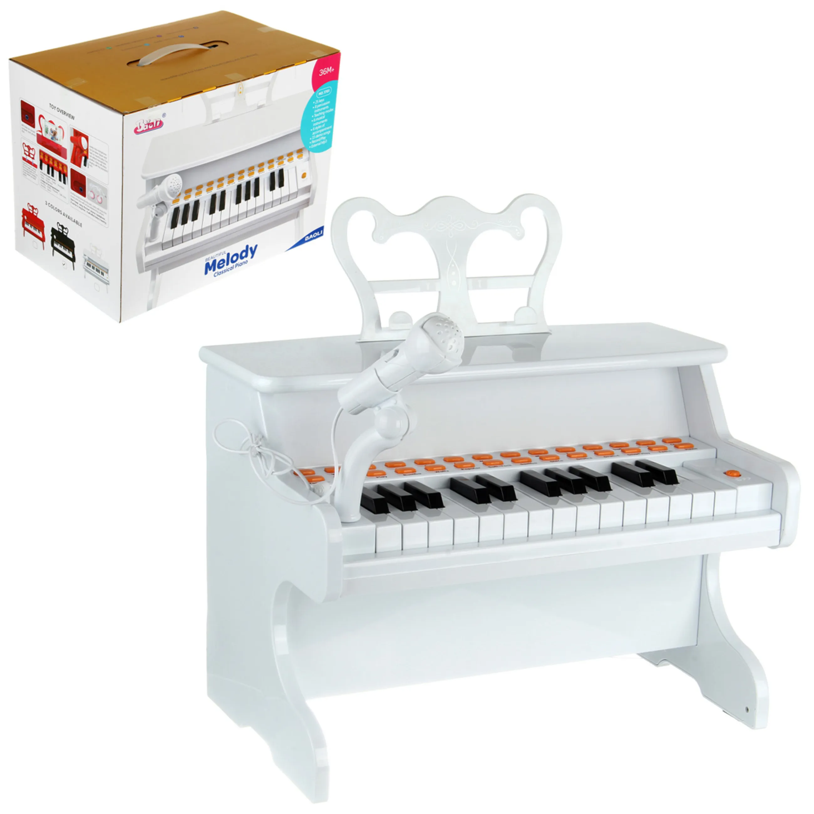 Пианино на бат., 25 клавиш, с микрофон., бел., 43-27-32 см, в кор.