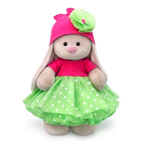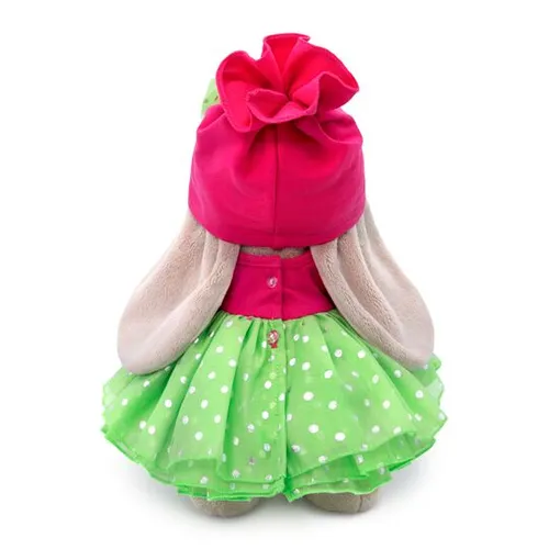 На Зайке Ми яркое платье в сочных оттенках малинового и зелёного. Верх платья сшит из плотного х/б трикотажа, юбочка из нескольких слоев хлопка с серебристыми горошками. На голове у Зайки шапочка, собранная сверху и украшенная составным цветком с розовой пуговкой в серединке.