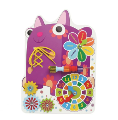 Среди деталей: шнуровка, часы с подвижными стрелками, цветик-семицветик с подвижной стрелкой, шестеренки и счеты с фигурными бусинами. Подложка – деревянная, изображение кошечки нанесено яркими и безопасными красками.