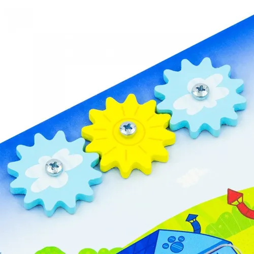 - Также ребенку будет интересно крутить шестеренки, стилизованные под облака с солнышком и заниматься шнуровкой.