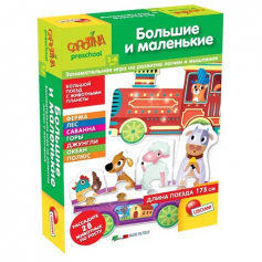 Оригинальный игровой набор, который состоит из длинного разноцветного поезда-паззла с вагончиками. Каждый вагончик представляет отдельное место обитания животных: ферма, лес, саванна, горы, джунгли, океан и полюс. Это видно по рисунку на самом вагоне. В каждом вагончике 4 места для размещения разных по высоте фигурок животных. Нужно определить, кто где обитает и разместить животных по росту – от самого маленького до самого высокого . Игра развивает словарный запас, расширяет кругозор, знакомит с названиями местностей и животных, развивает мелкую моторику рук. Длина поезда-паззла 175 см.